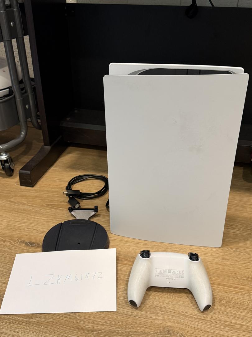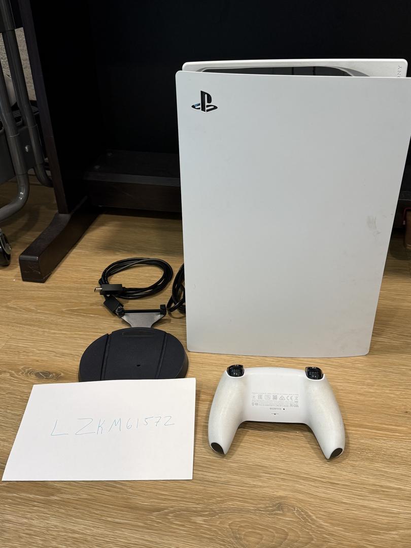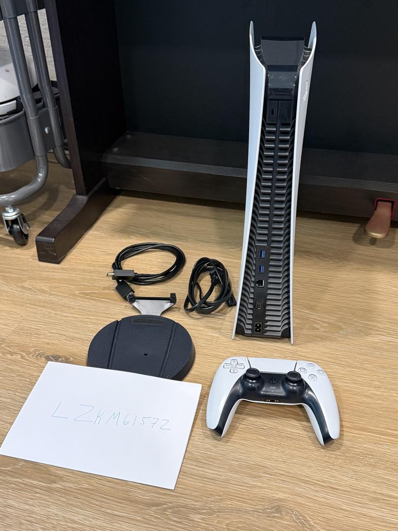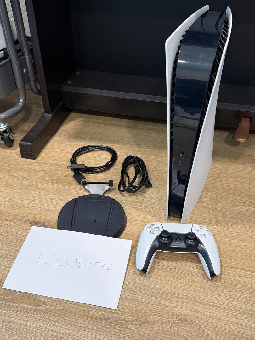 PS5 digital edition comes with: 1 controller, vertical stand, HDMI cable, power cable. 825GB of built in storage. Everything works as expected.