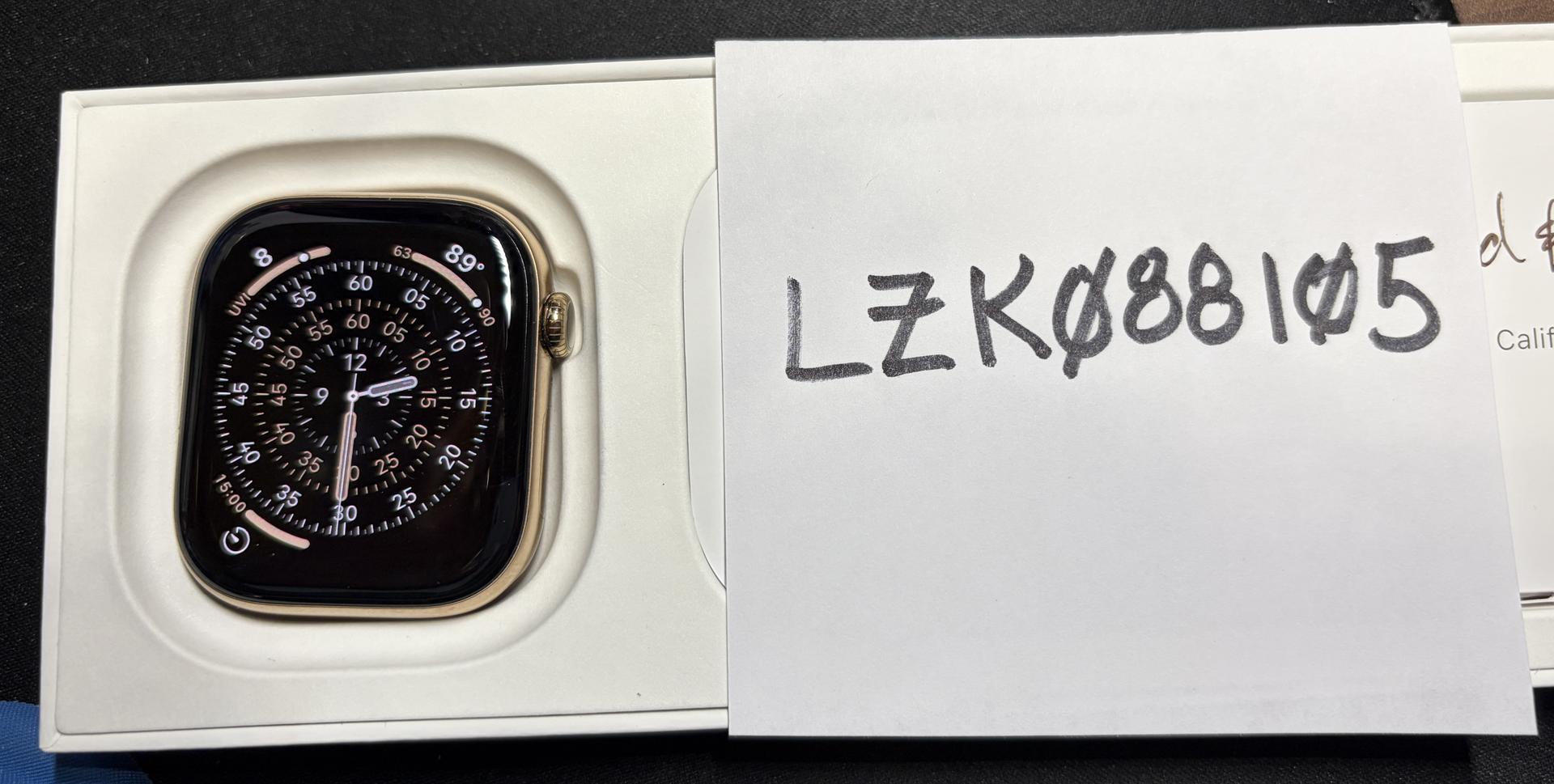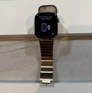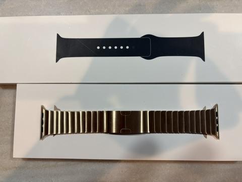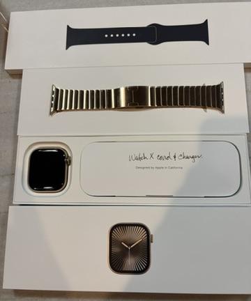 Apple Watch 10 bought just last year. Comes with the Gold Link Band and a Black Sports Band. The Sports Band has never been used. This is the top-of-the-line Apple Watch for 2024. The Gold Link Band was a premium and a hard to find item. All have been gently use and will be sent in their original Apple box. Watch will be factor reset as new. I ship promptly via UPS.