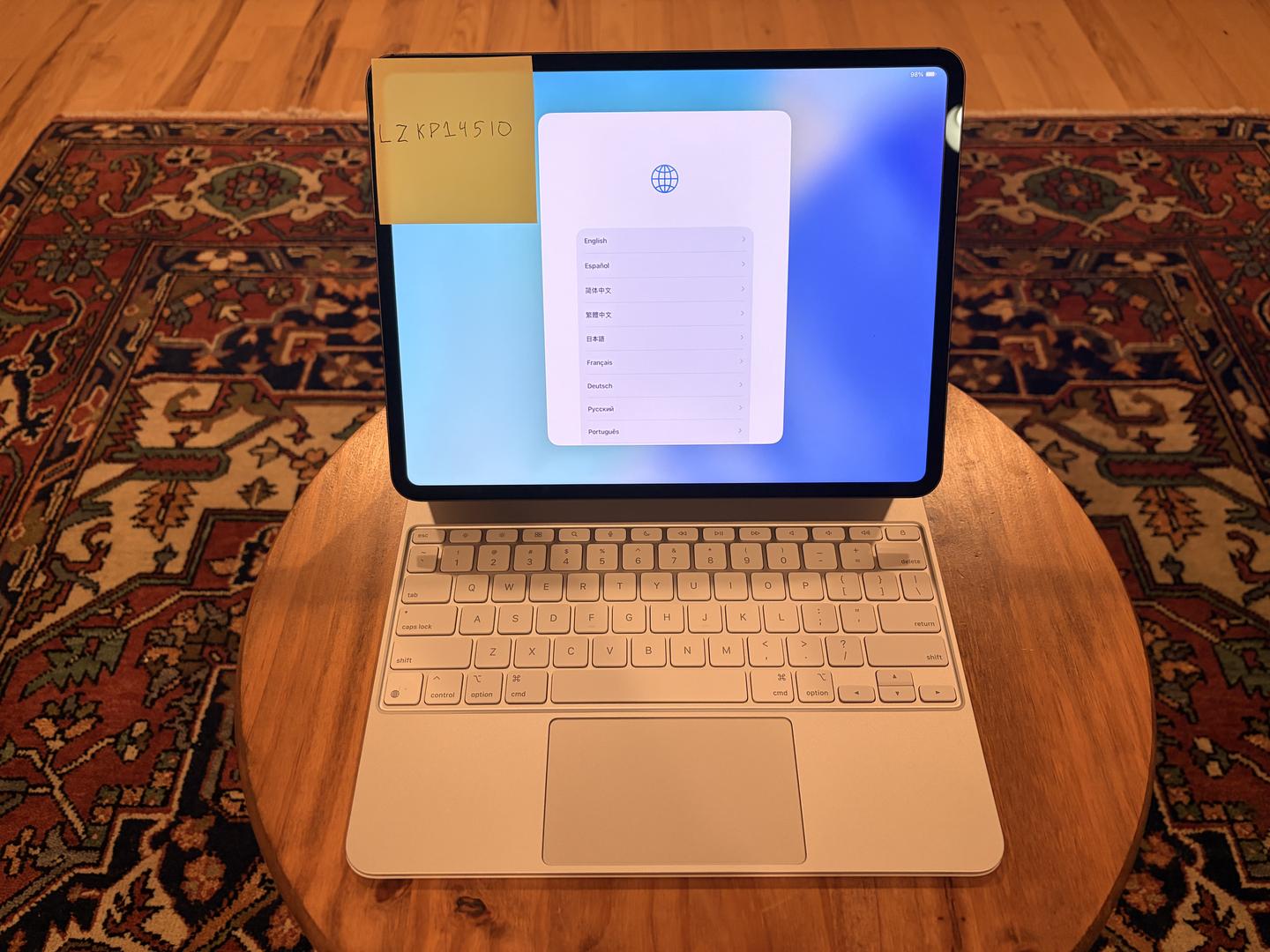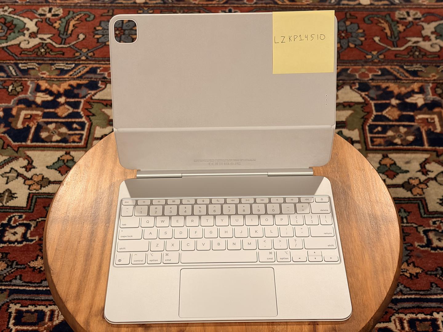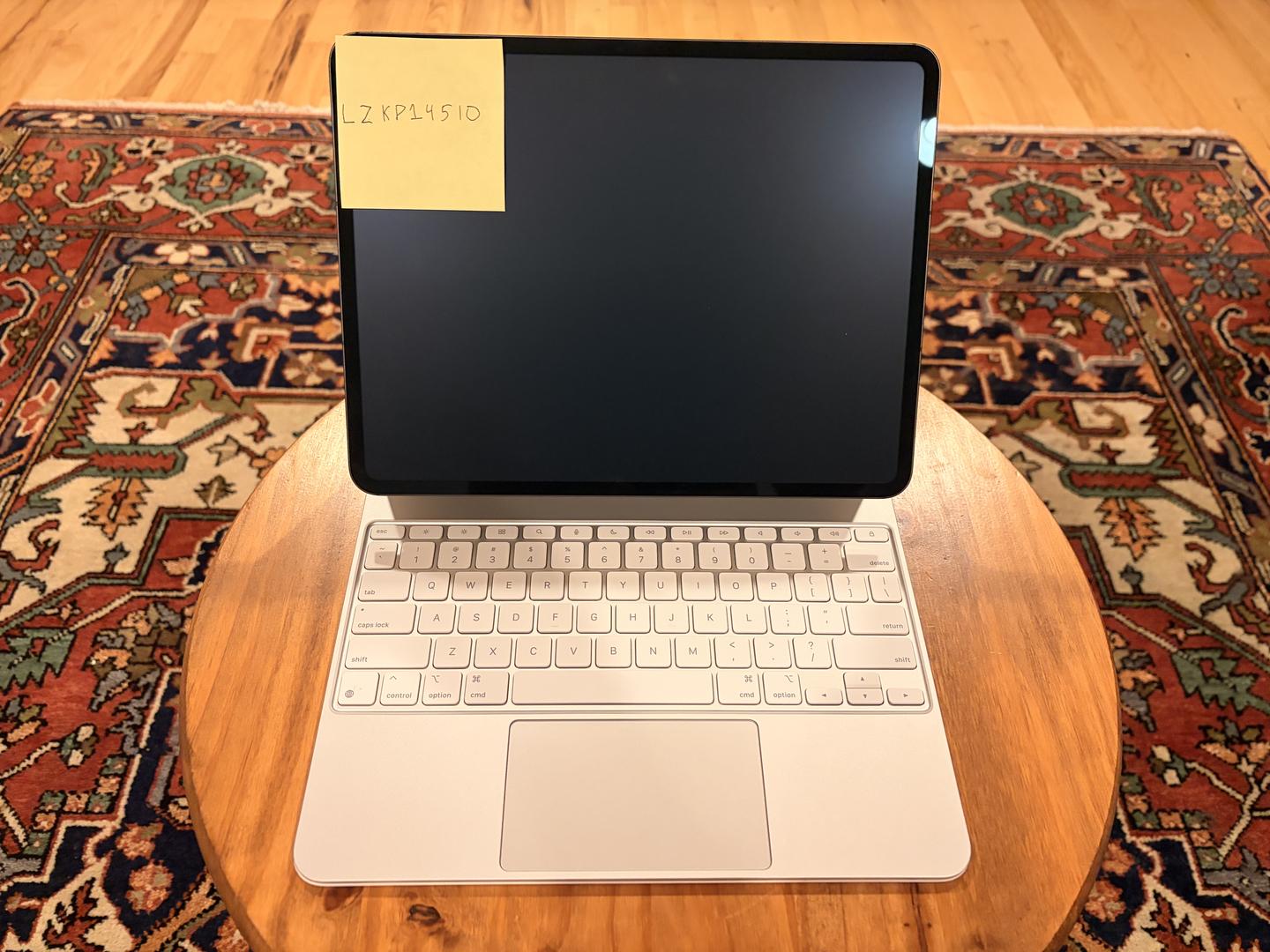 iPad Pro 1TB (Cellular) in mint condition with 16GB memory, AppleCare+ until May 7, 2027, 100% battery health with only 17 cycles, featuring the Nano-Texture Display that reduces glare and reflections from sunlight, and includes a minimally used White Magic Keyboard.