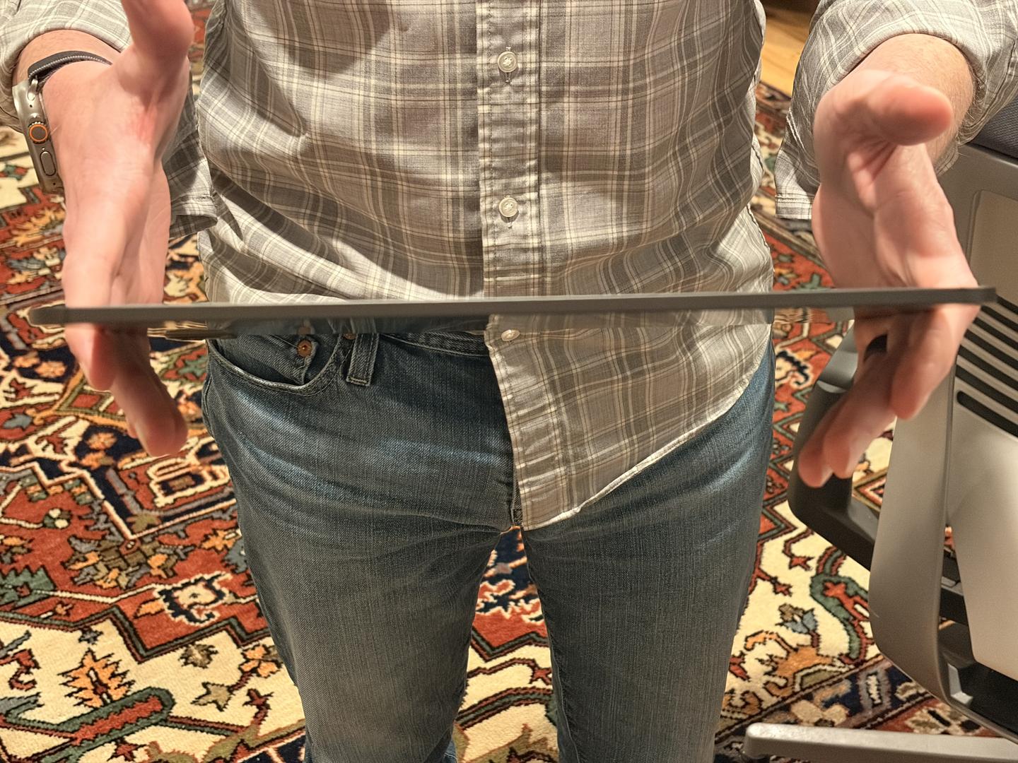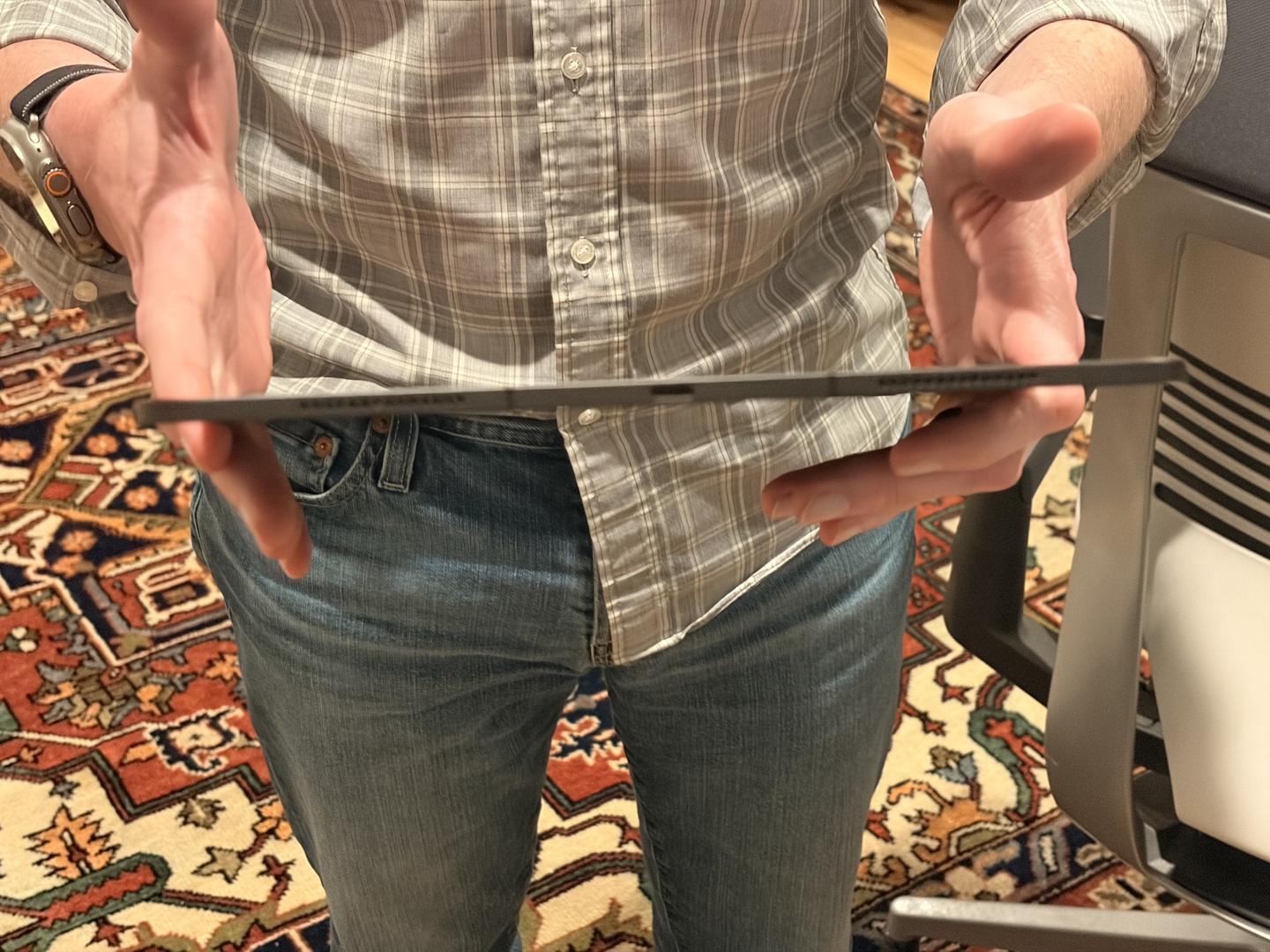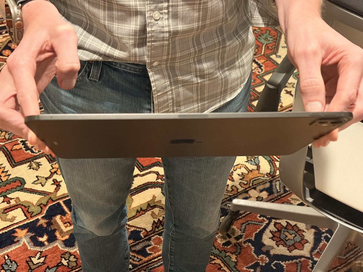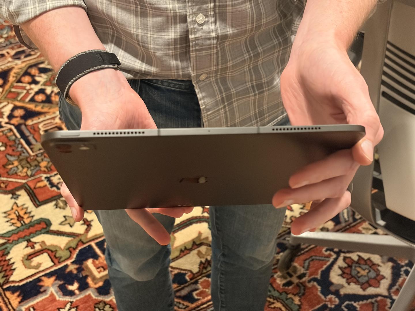 iPad Pro 1TB (Cellular) in mint condition with 16GB memory, AppleCare+ until May 7, 2027, 100% battery health with only 17 cycles, featuring the Nano-Texture Display that reduces glare and reflections from sunlight, and includes a minimally used White Magic Keyboard.
