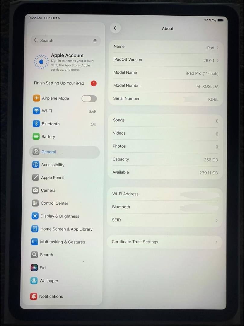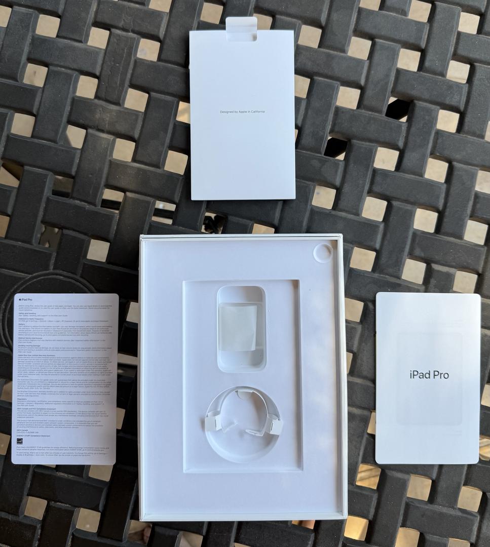 iPad Pro 11” 256GB, non-cell-enabled (Wi-Fi only), grey anodized finish. Updated to iPadOS 26. Includes original box and documentation but no original accessories.