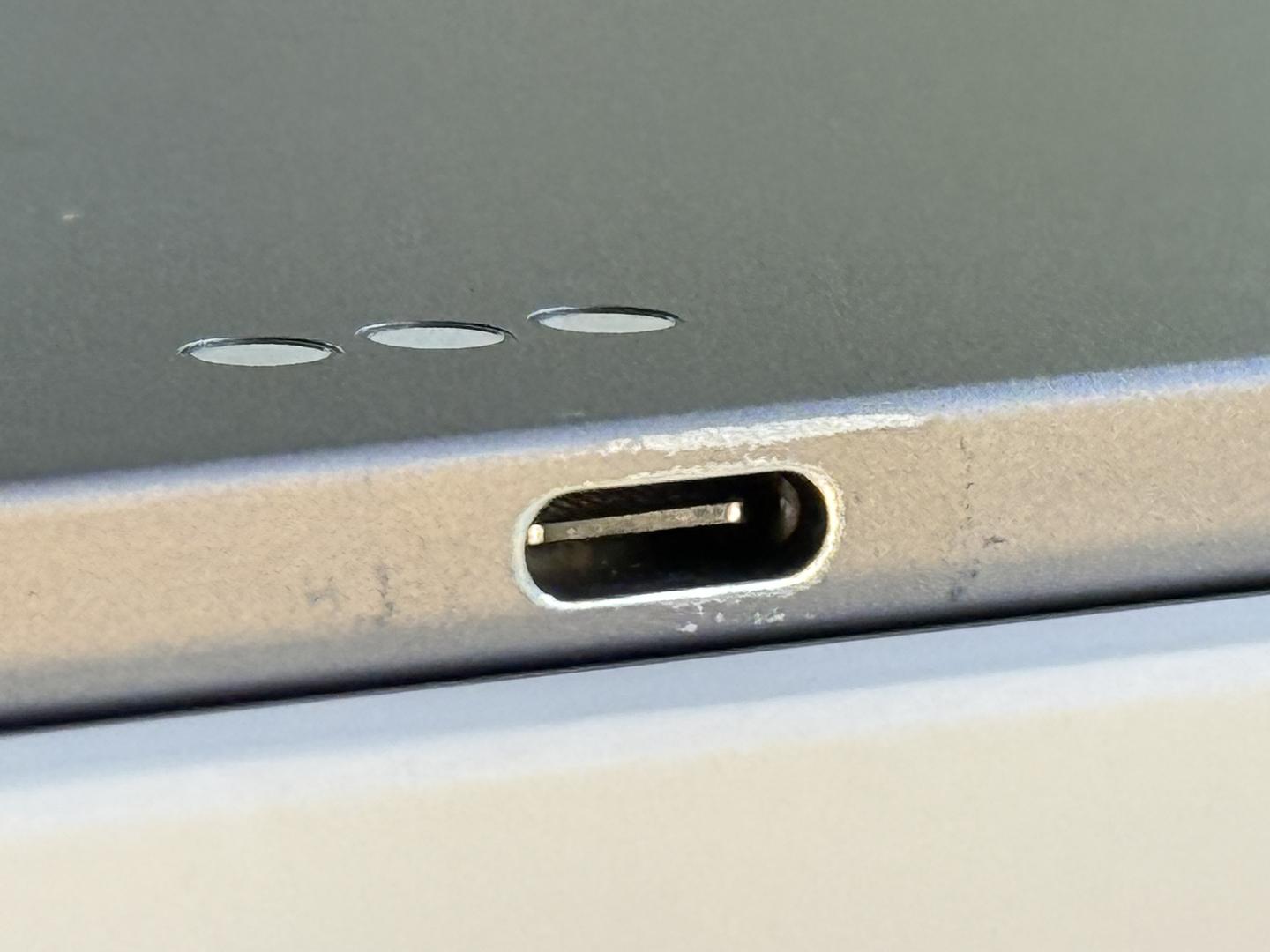 Surface-level, cosmetic scratches across the screen, some wear on the grey anodized around the charge port