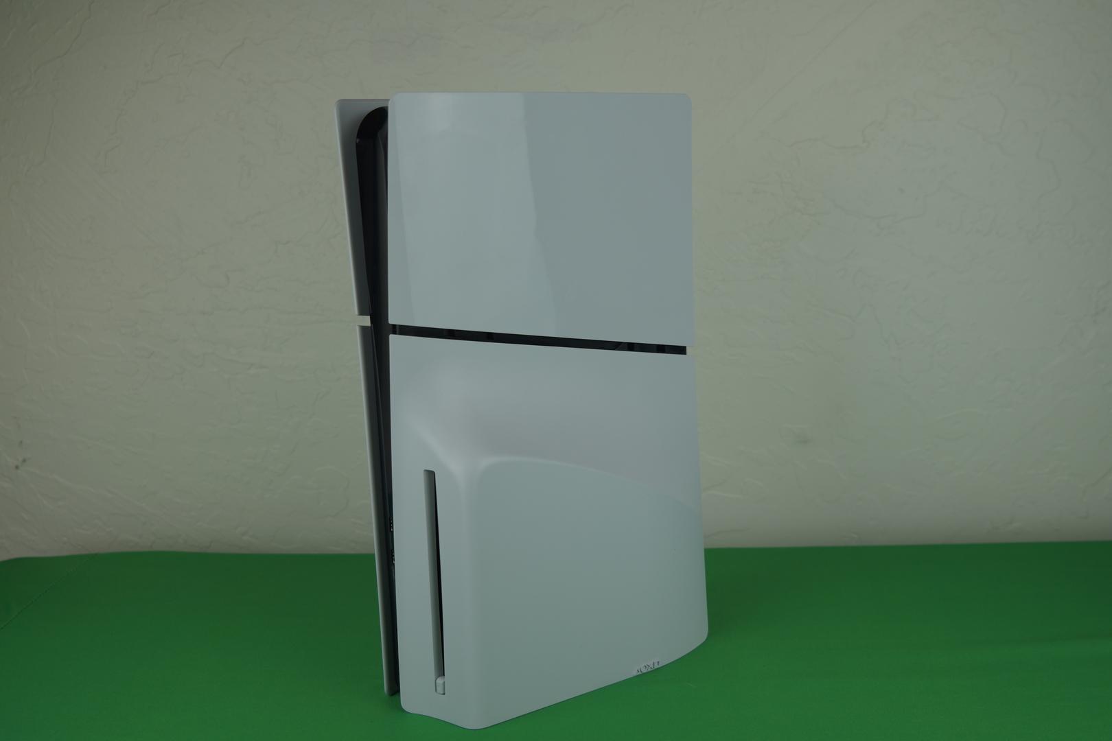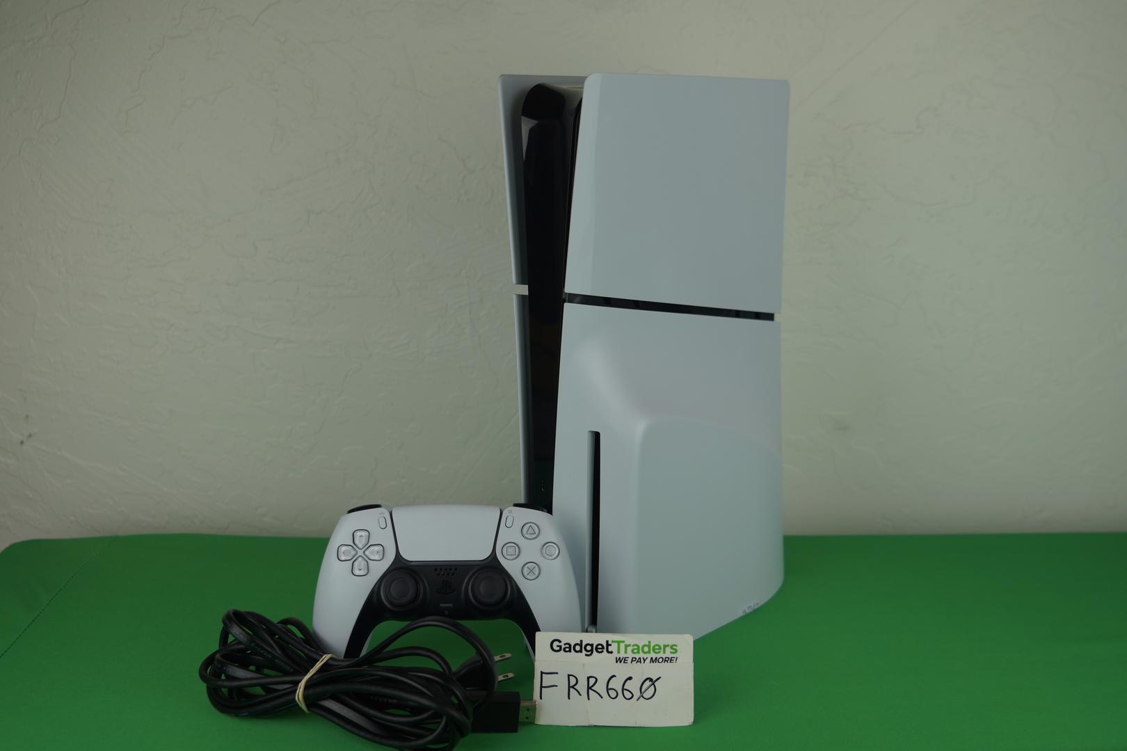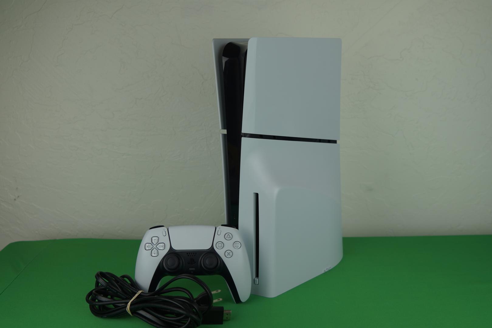 Used PS5 Slim Disc Edition (1TB) in great condition. Plates and frame show minor scratches and scuffs, but overall clean and fully functional. Reference photos for details. Includes original controller, power cord, and HDMI cable.