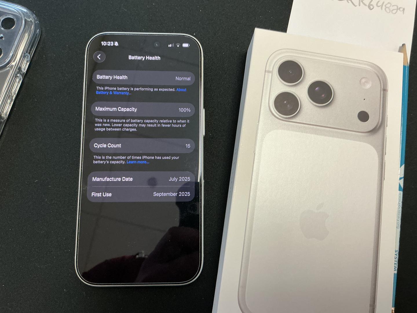 The sale includes the phone, its original box, original charging cable, and the clear case from ESR pictured above. The battery is at 100% with 15 cycles. I'm selling this one since I bought the 17 Pro Max instead. Absolutely no freight forwarding or international sales. Shipping within the US only.