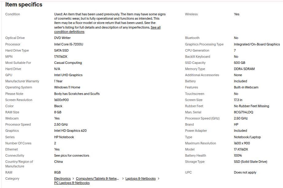 Used in overall good condition with some scratching on lid and on bottom cover as shown. Nothing extreme. Comes with genuine HP power adapter. Battery Health 100%. More unit specs shown in pics in specs chart.