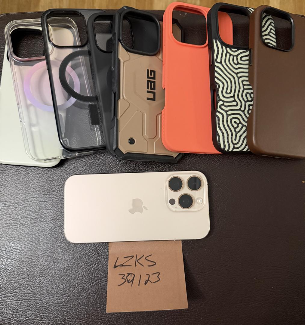 Mint condition iPhone 16 Pro in Desert Titanium. No scratches or scuff. Has ZAGG Screen Protector. Will also include addtl screen protector. Been in cases 100% of the time. Will be including 8-10 phone cases(no box). Also original iPhone 16 Pro with unused original USB cables.