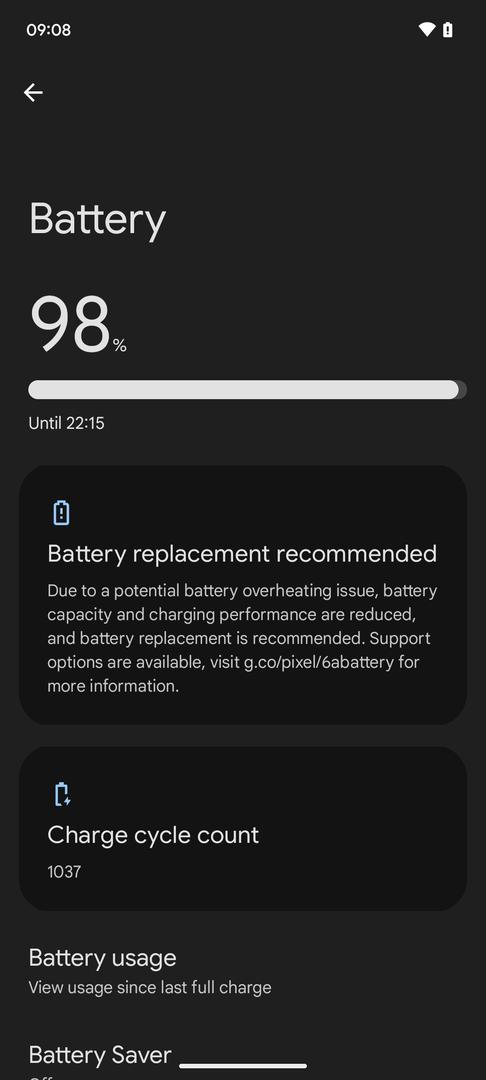 Battery replacement is recommended by Google. Charge cycle count is 1037.