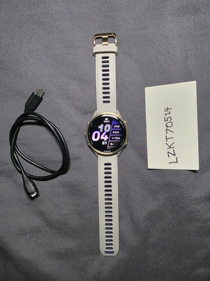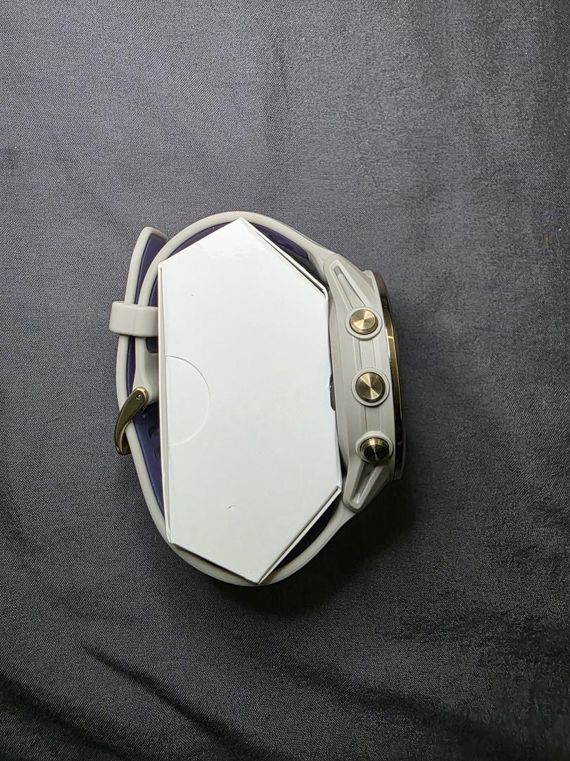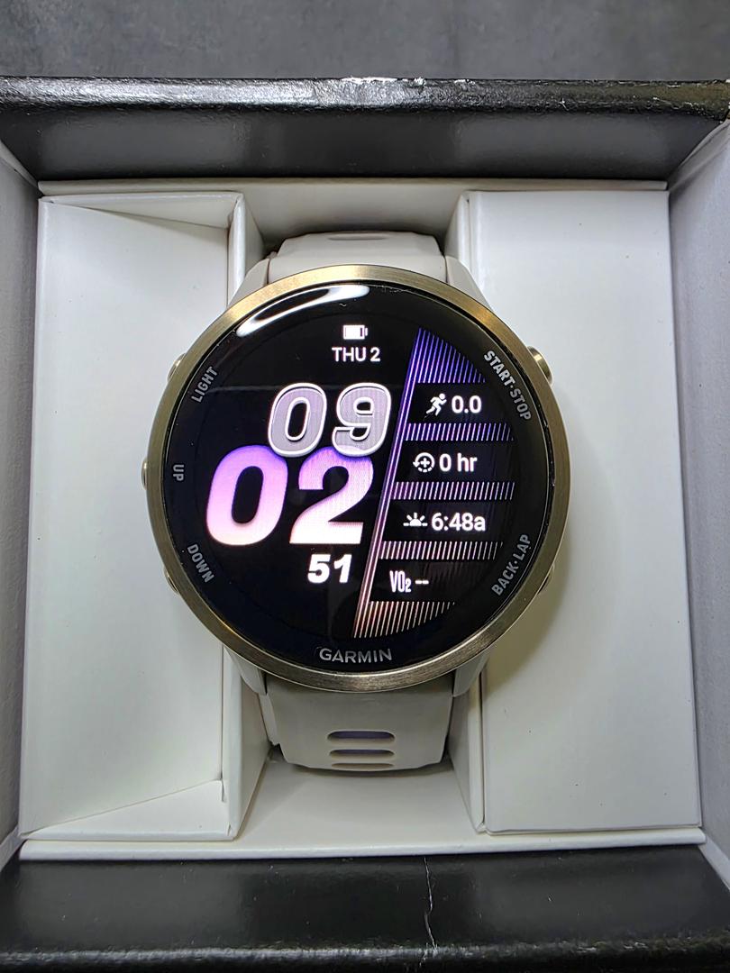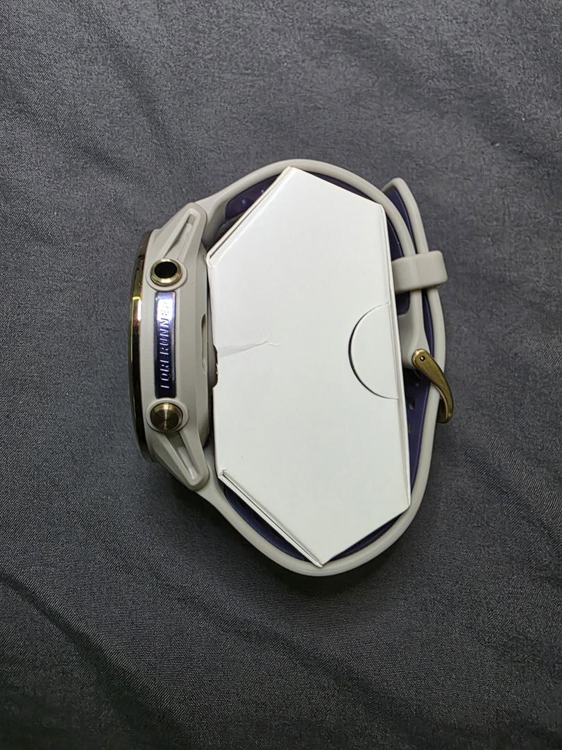 Probably the best running watch out. This watch is in mint condition. It was charged and tried on but never used. Website says it's a Soft Gold Titanium with French Gray Case and French Gray/Translucent Indigo Band.