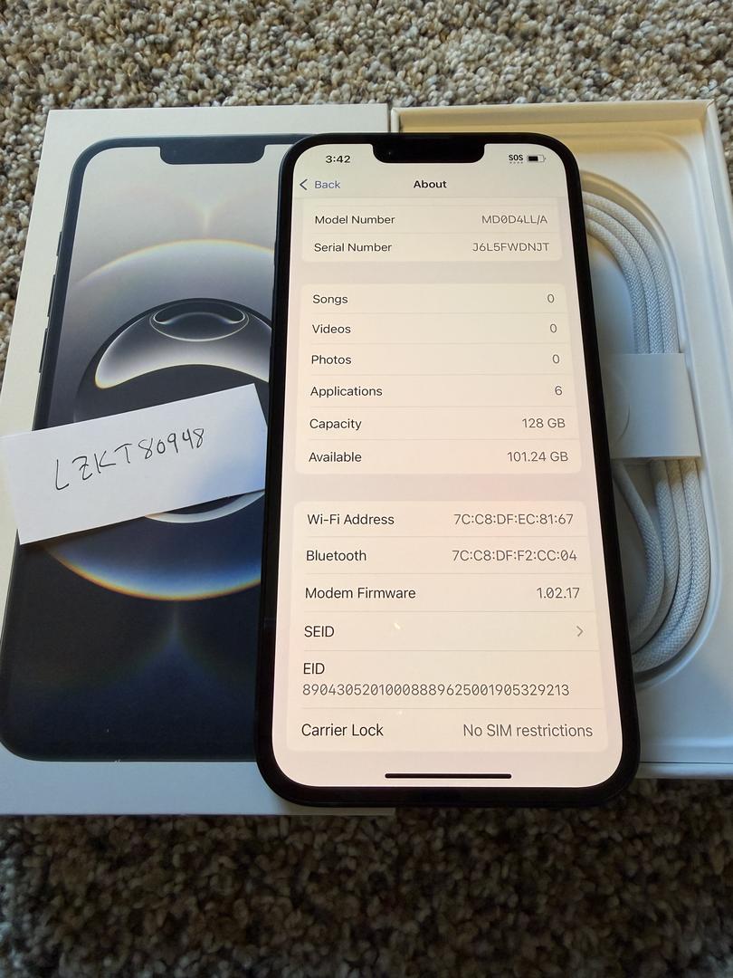 The phone's battery shows a 0 cycle count (basically new)