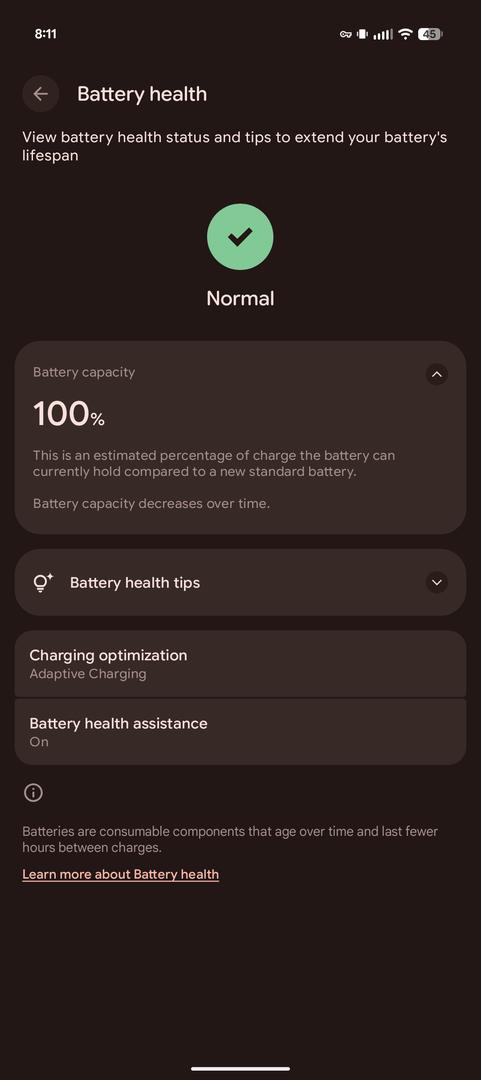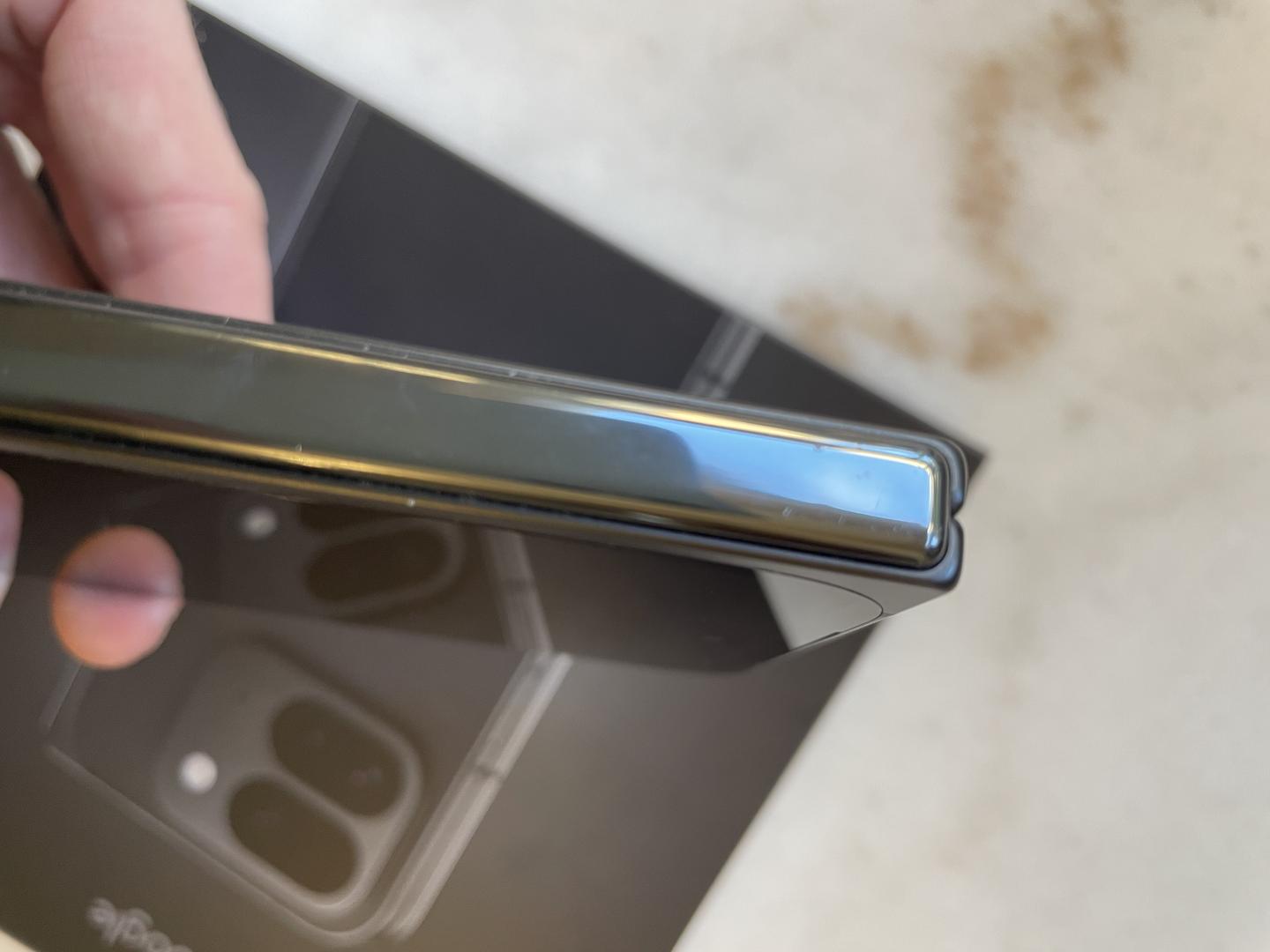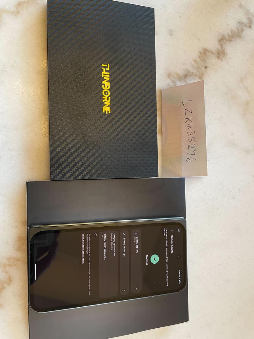100% battery health as barely old, only couple signs of wear not noticable until specifically went looking - 2 micro nips on the top of hinge (downside of Thinborne which doesn't protect hinge), and small signs when unfolded if look close in corners/border (common if you ever put in pocket & not noticeable)