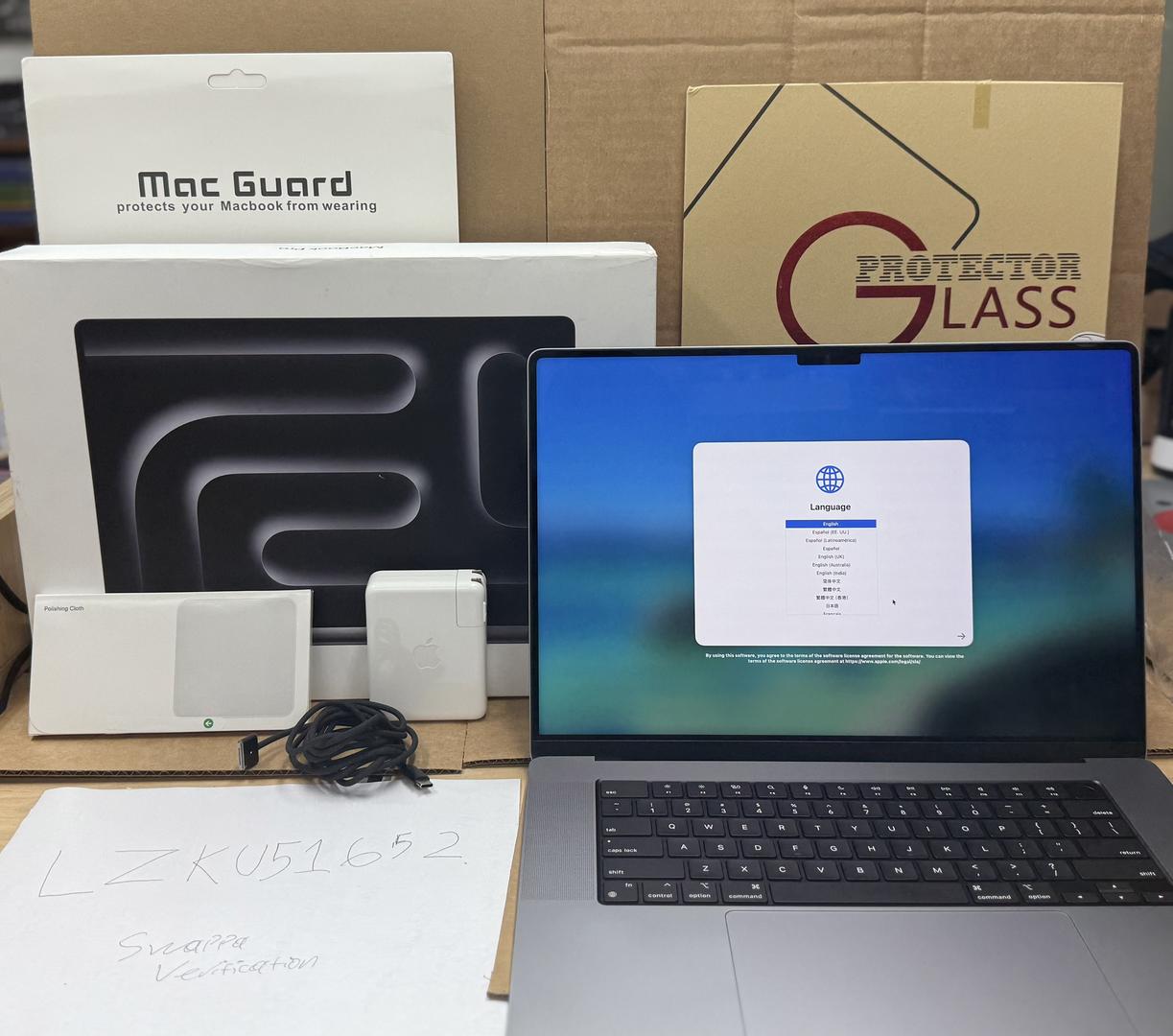 Order Includes: Original 140W MagSafe 3 charger, screen protector, protective covers, and microfiber cloth. Also includes a genuine Apple 16" MacBook Pro retail box.