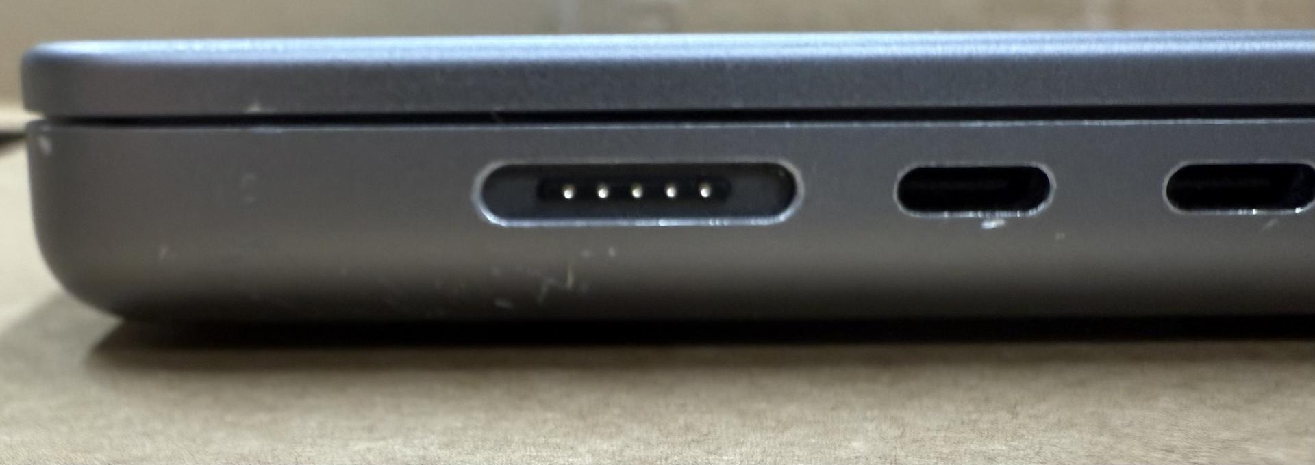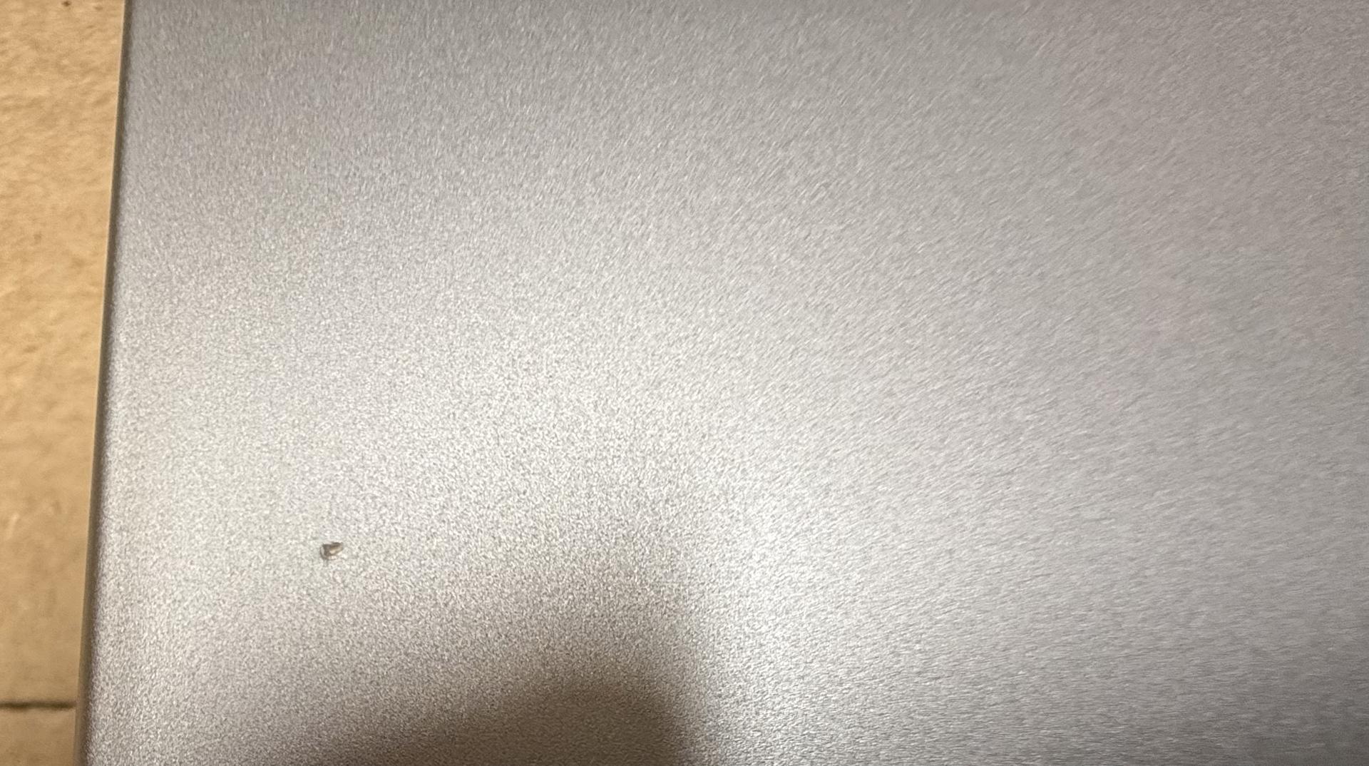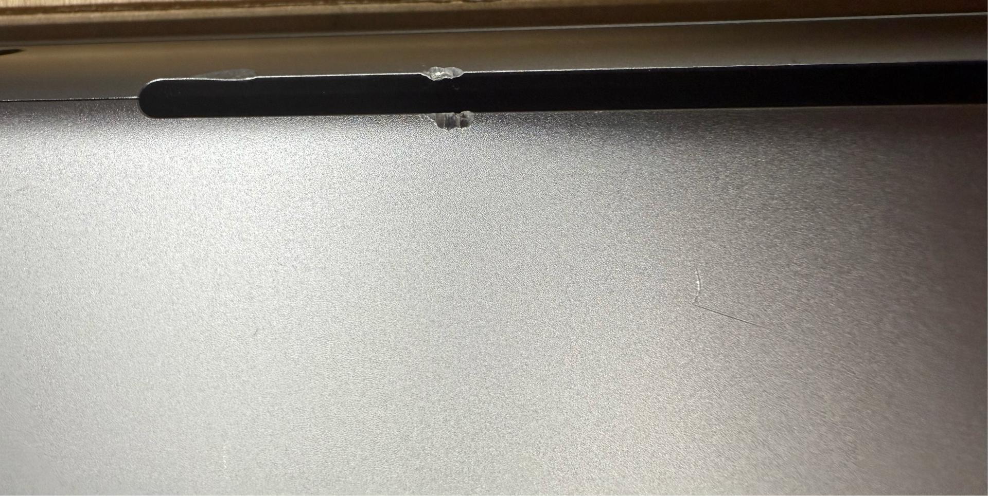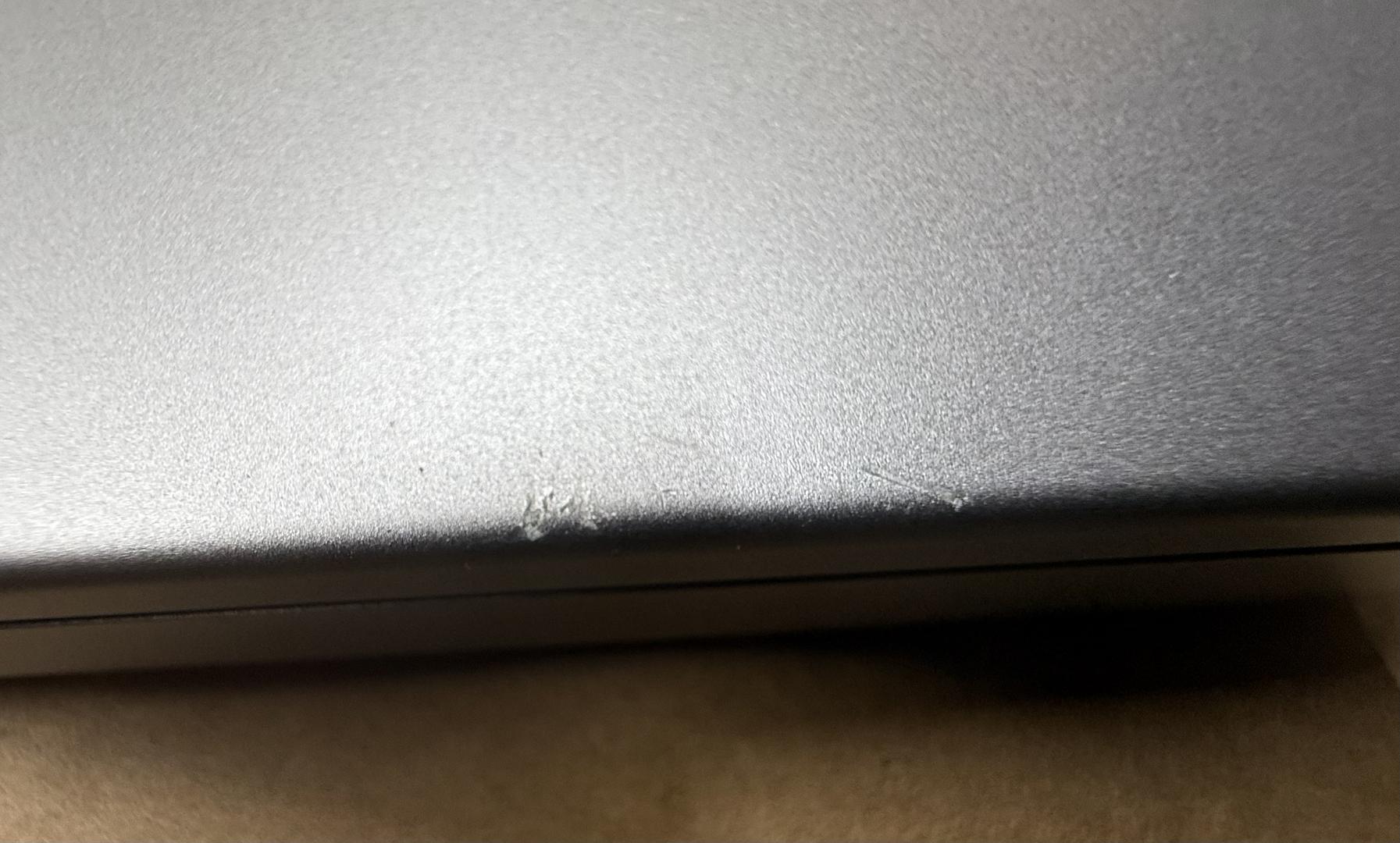 This MacBook is in good physical condition. There are scuffs around the MagSafe port, and a small dent/chip in the bottom cover near an air intake. There is also a shiny spot at the top right edge of the screen. This is purely cosmetic, and does not interfere with the screen itself, nor does it reduce the screen's durability.
