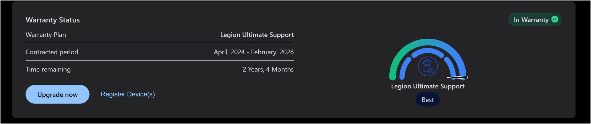 Laptop comes with extended warranty I paid for: Legion Ultimate Support - End February 2028. As seen in attached screenshot.