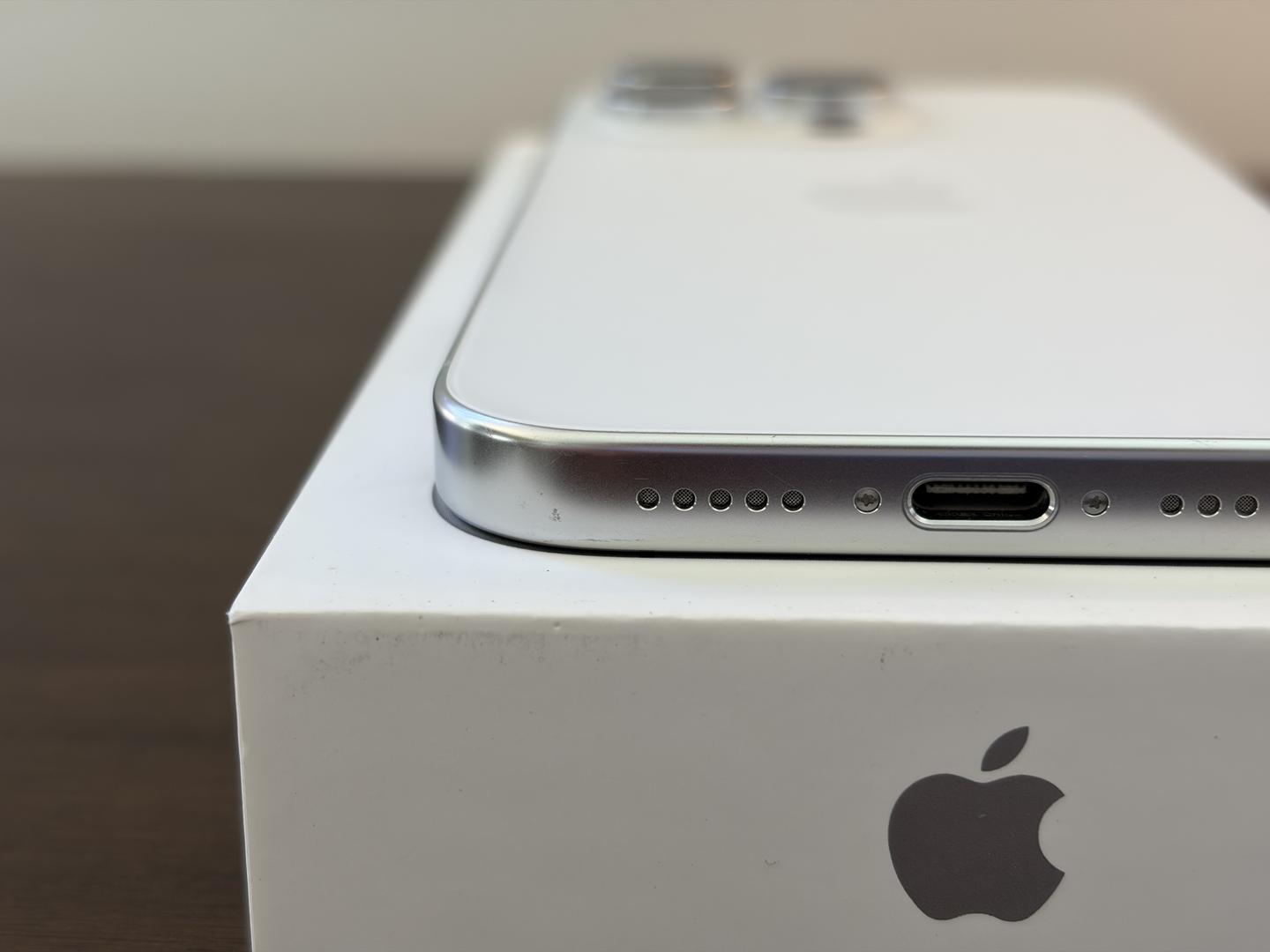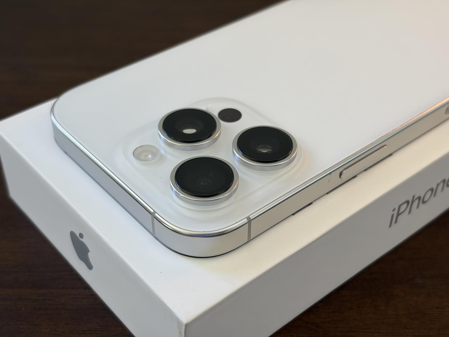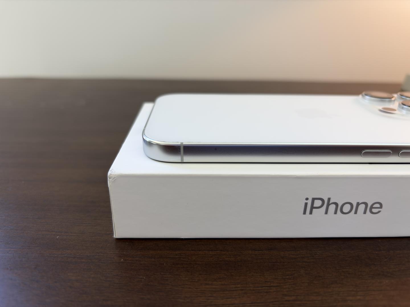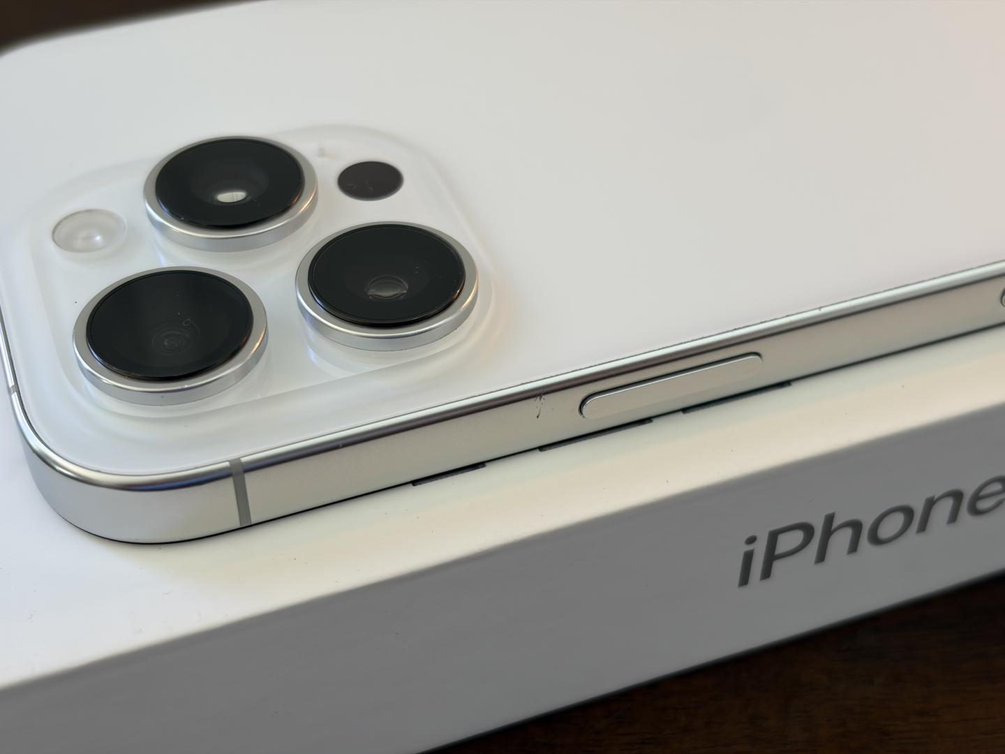 iPhone has light scratches and scuffs on the titanium frame, and a deeper mark above the power button.