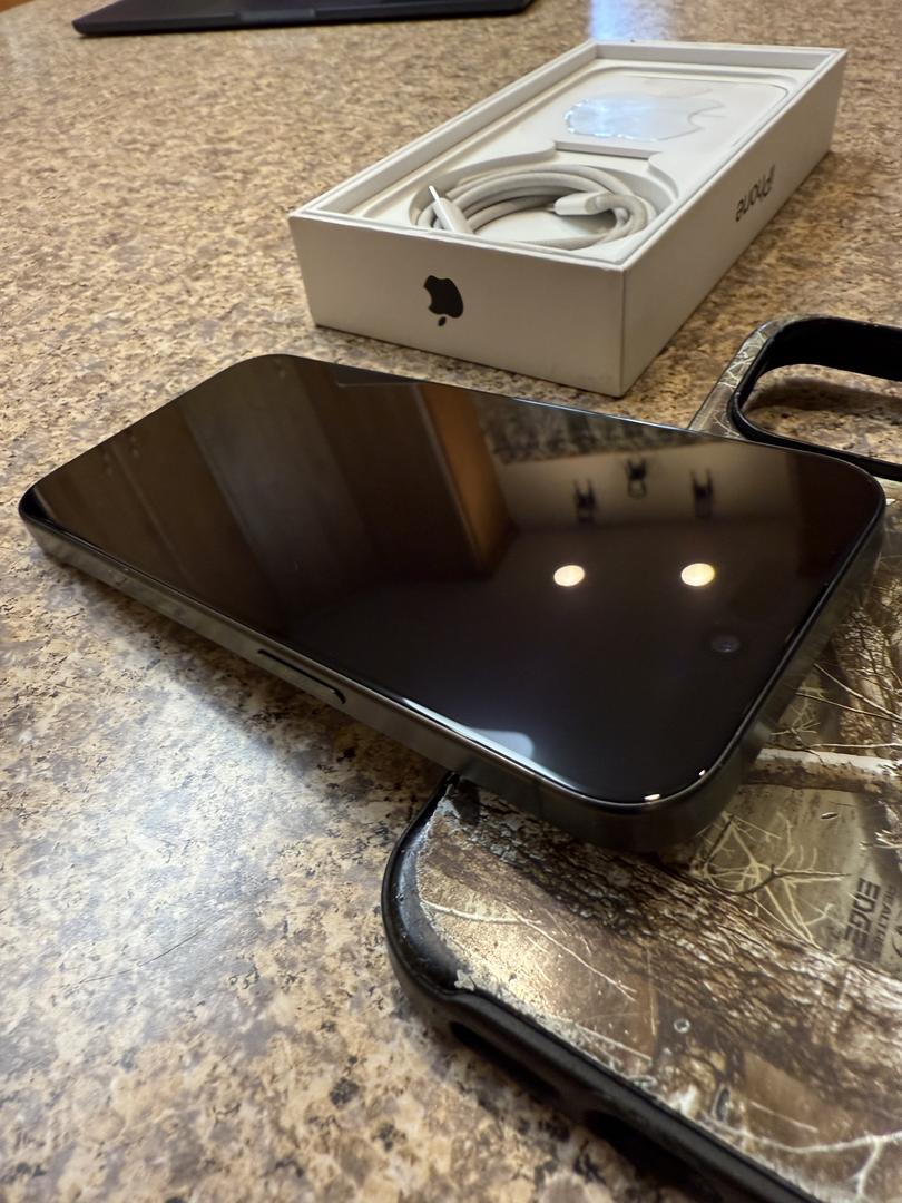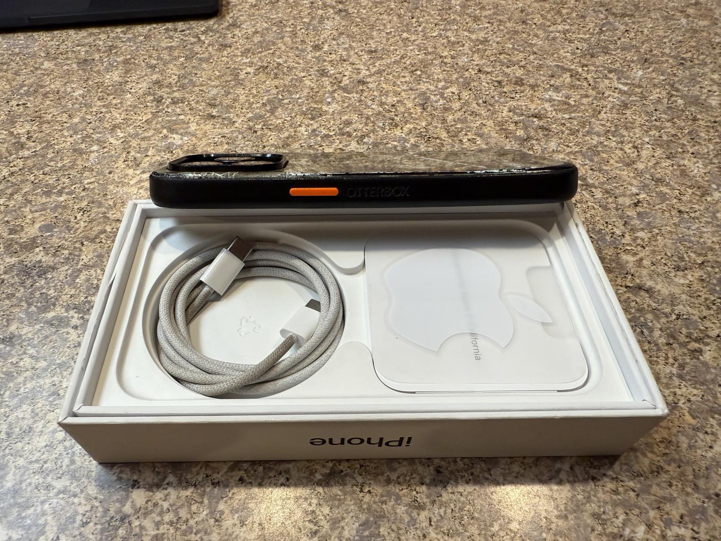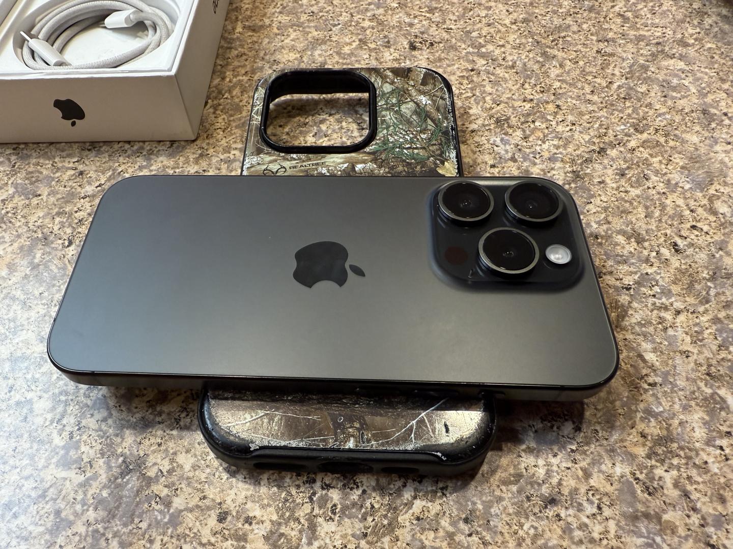 This listing is a for a 15 pro black titanium 256gb storage - included is the box, papers, apple logo sticker and a 20w charger with usbc to usbc cord. Additionally, I’m throwing in my old realtree camouflage otter box symmetry(???) case!