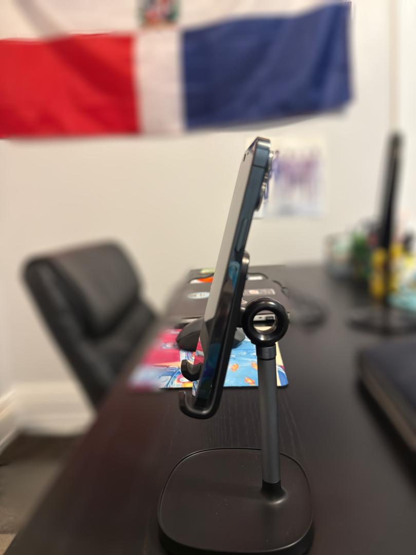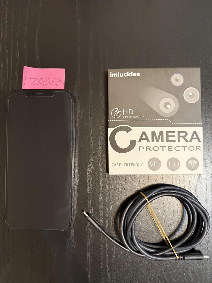 Comes with two camera lens protectors and a 6ft USB C to Lightning charging cable. A camera lens protector is already on the phone. The device is unlocked and paid off.