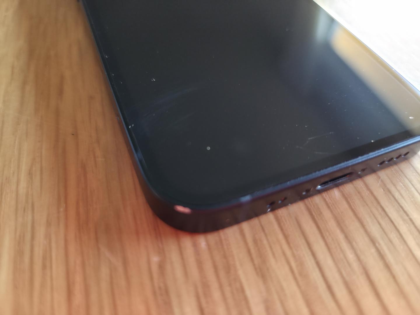 Small light scratch at the bottom of the screen. Small paint chip on the left lower corner. Paint rubbed off around the camera ring. Includes 1 tempered glass screen protector with applicator, 2 silicone magsafe cases, and 2 silicone bumpers!