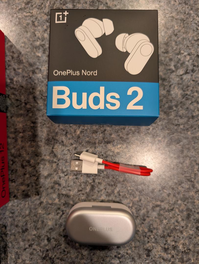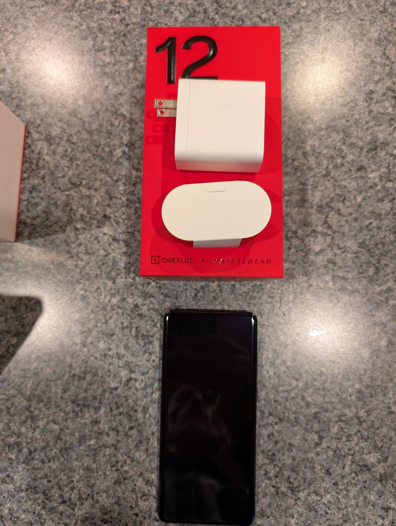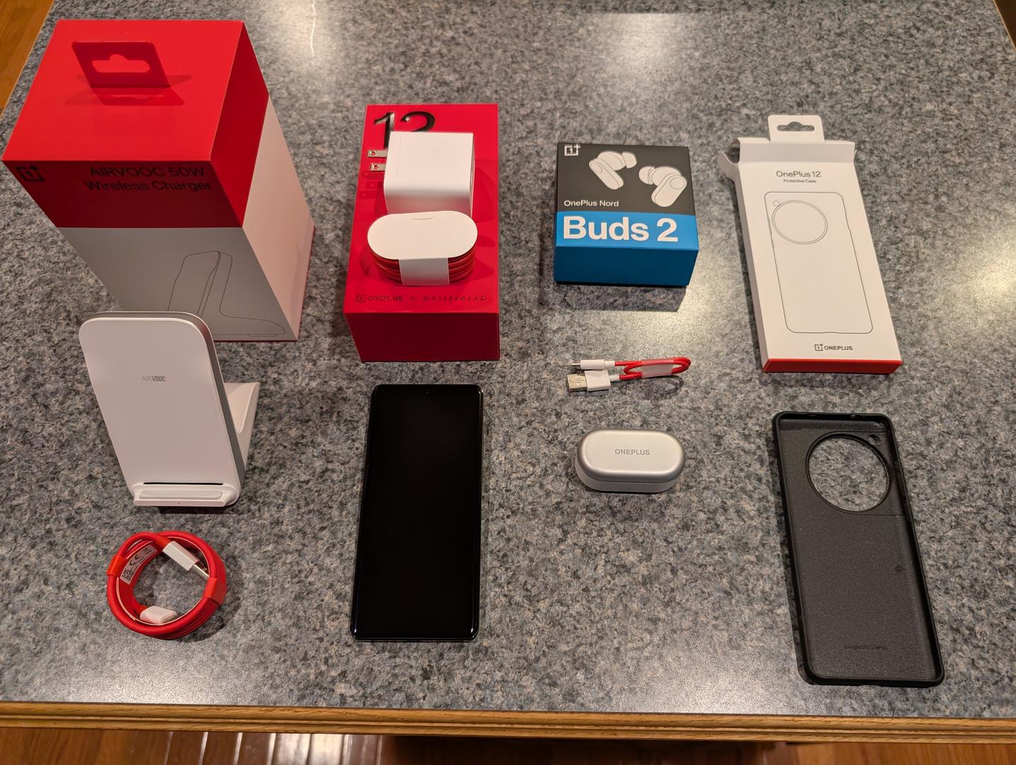 Unlocked OnePlus 12, OnePlus AIRVOOC 50W Wireless Charger, OnePlus Sandstone Case, OnePlus Nord Buds 2. including all original packing and cables.