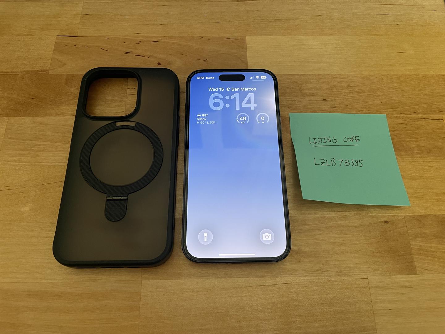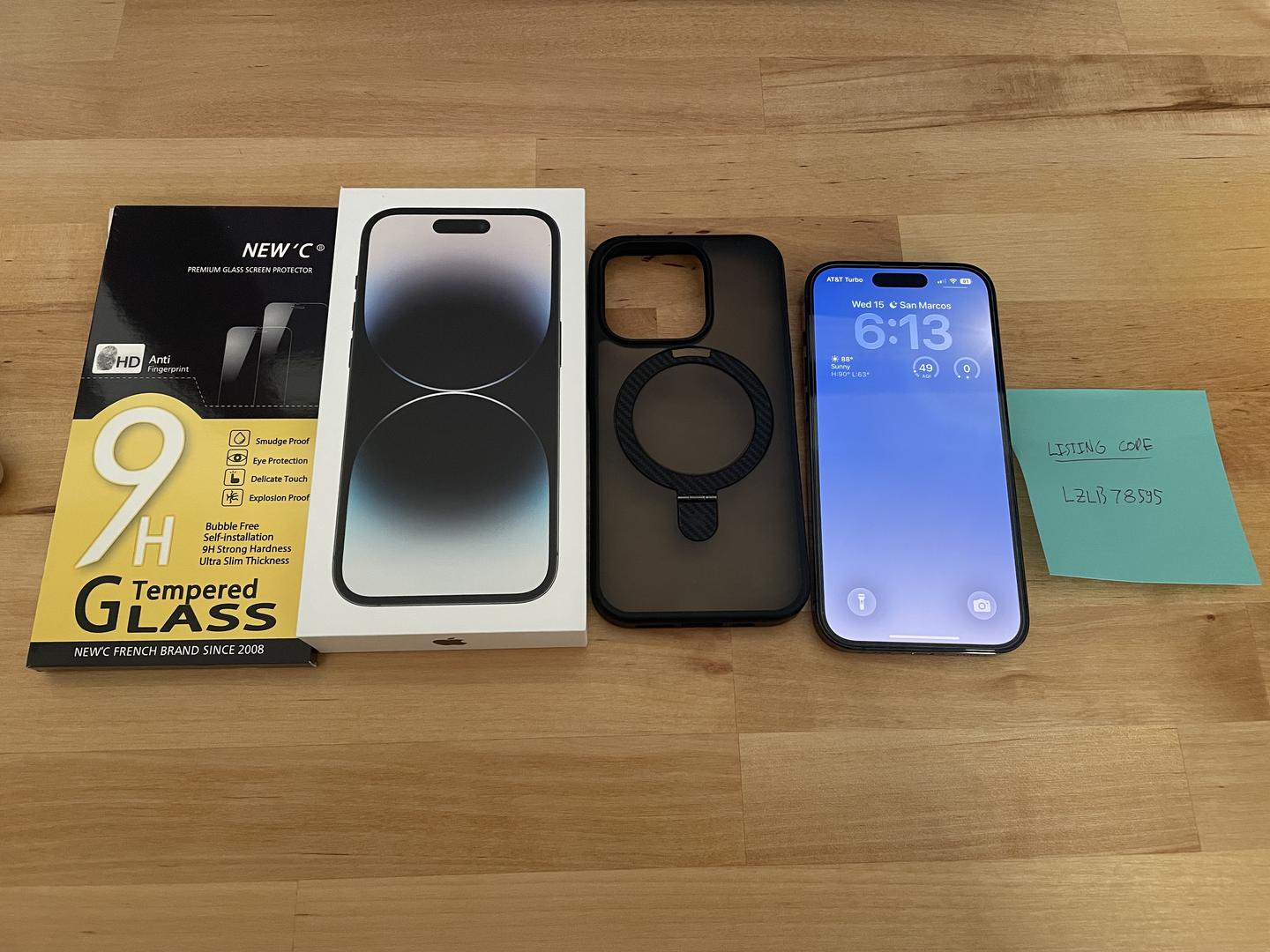 Selling my iPhone 14 Pro with the original box and several accessories. I purchased it in June of 2023. The battery is at 81% health. The phone has a glass screen protector installed and is in pristine condition with no scratches on the screen or frame. Comes with a CaseKoo Magic Stand carbon fiber case, the installed glass screen protector with 2 extras, and original charging cable.
