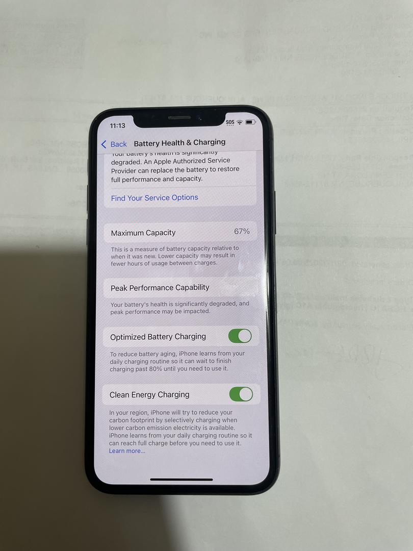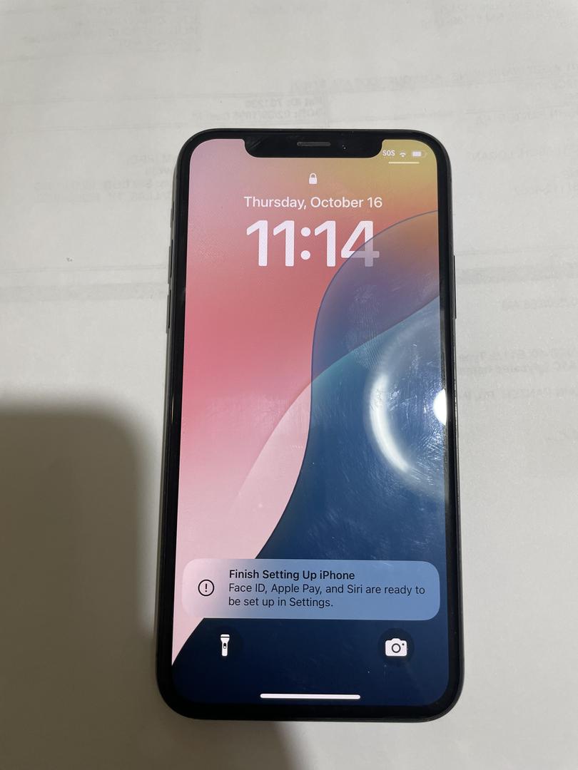 Battery health is 67%, and a replacement is recommended for optimal battery life. The device powers on, functions properly, and has been reset to factory settings. Face ID, Apple Pay, and Siri are ready to be set up by the next owner.