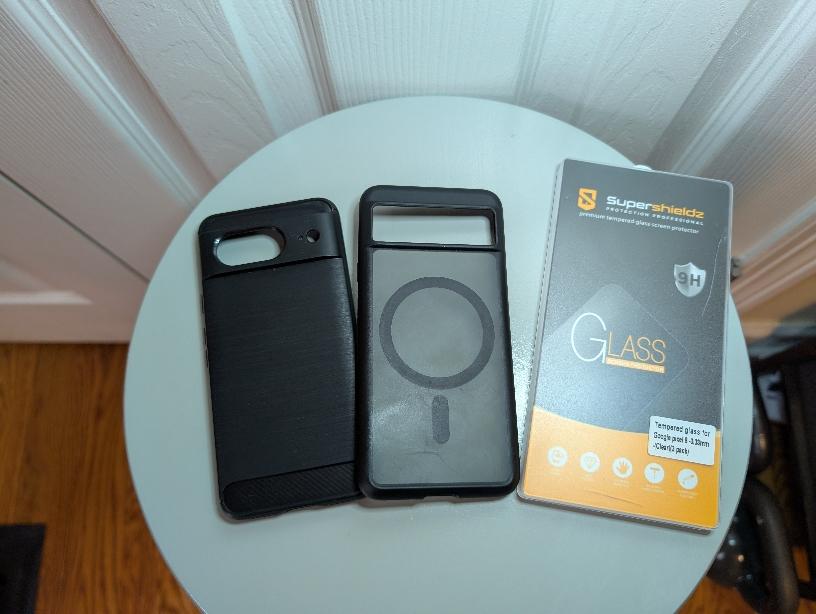 Sale includes Pixel 8 phone, box, cables, and two cases. It has back glass scratches on the bottom right of the phone, but other than that there's no physical damage. A screen protector is already applied with minor damage to the screen protector. Box of extra protectors also included.