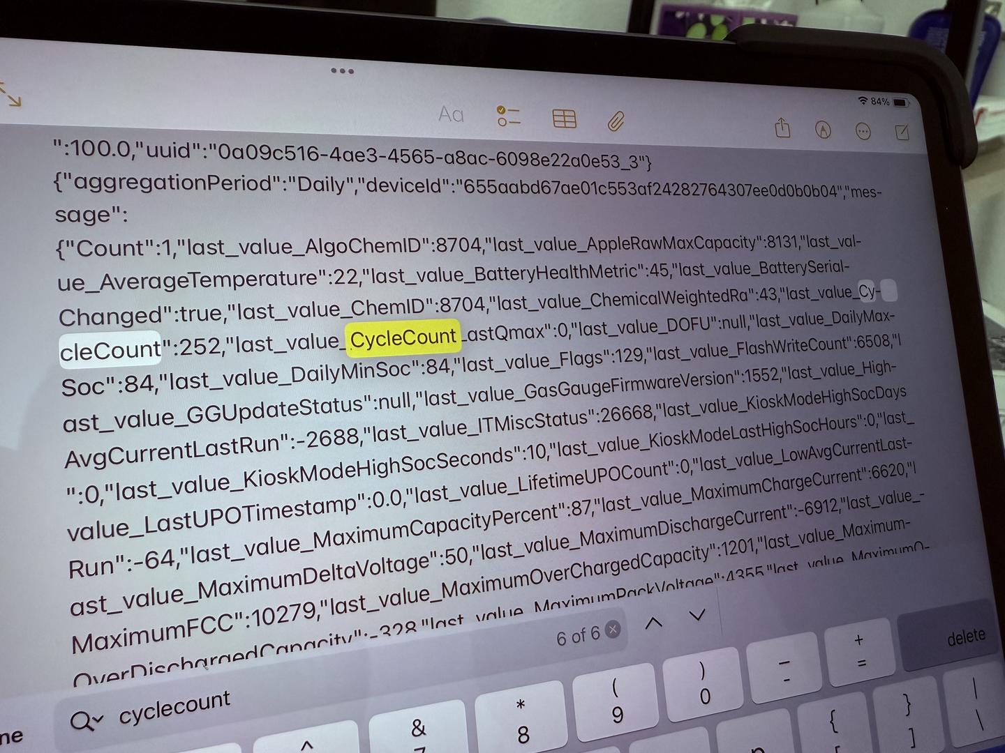 Hey Kenny. I unfortunately do not. I google how to check cycle count and I enable share IPad Analytics but it won't give me a file until 24 hours from now. I'll update tomorrow