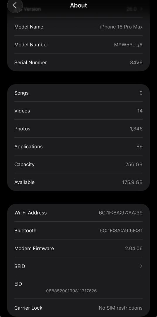 For sale is an Apple iPhone 16 Pro 256gb in Desert Titanium in mint condition. Phone was bought from Apple directly and is Unlocked. Comes with AppleCare+ till 09/21/26. Battery level is at 96% with 323 cycle count.