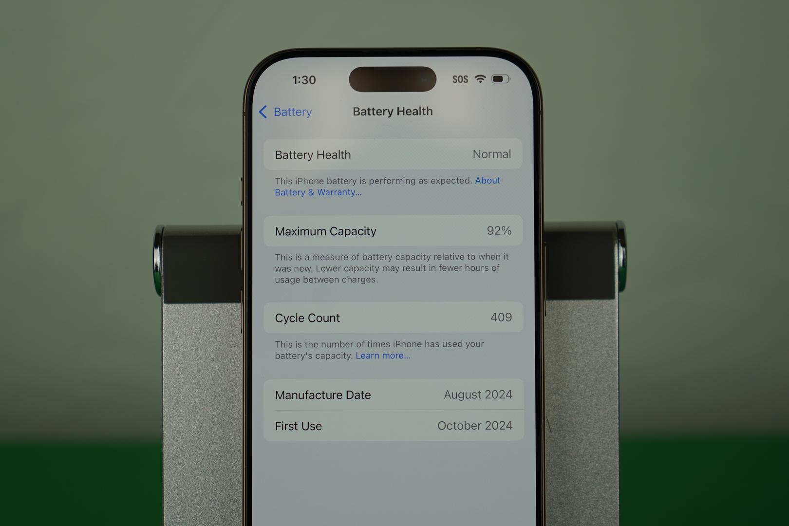 Battery health: 92% with 409 cycles