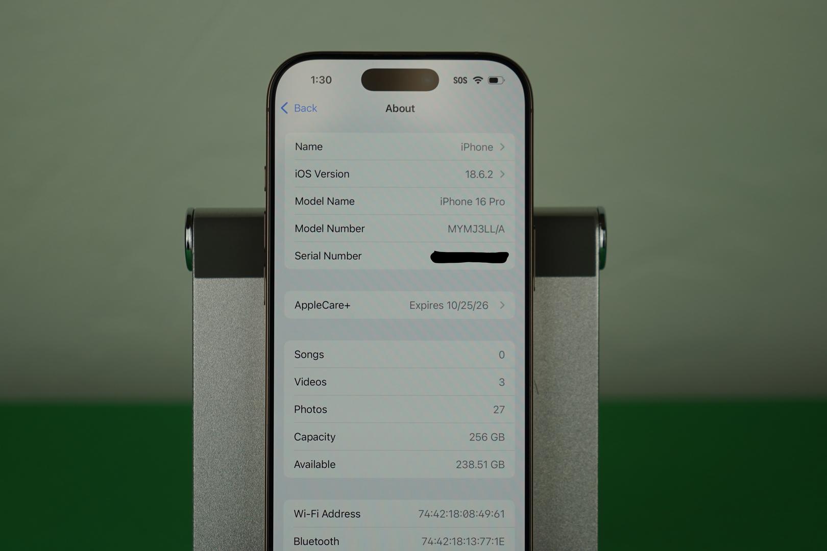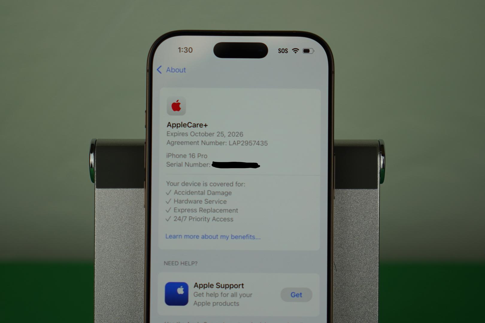 AppleCare+ coverage valid until 10/25/26 (no original receipt available)