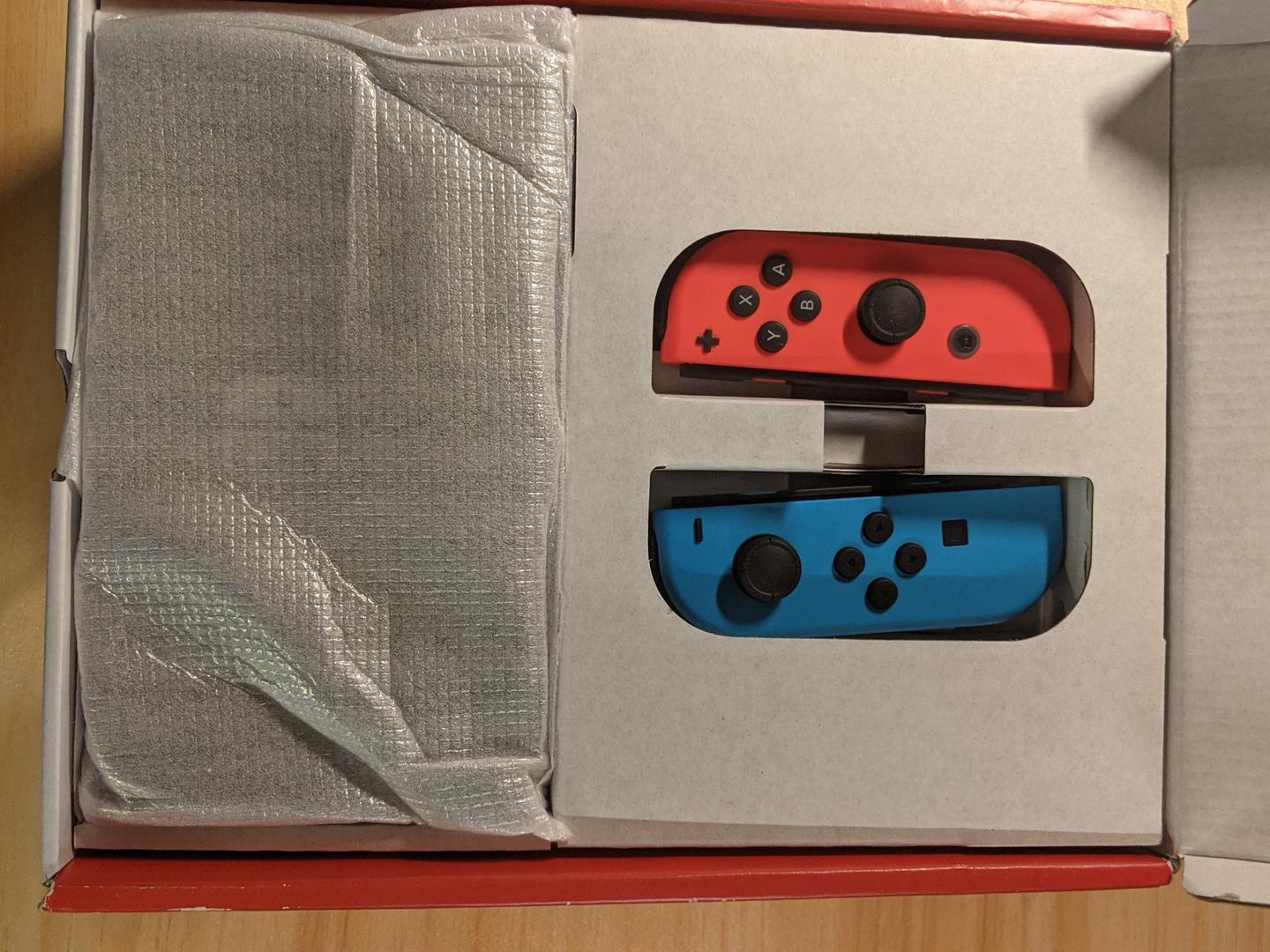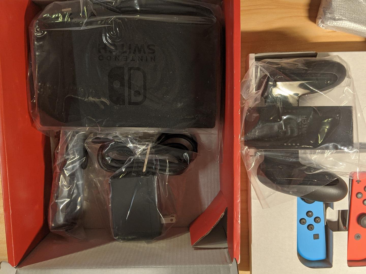 Package-- switch, joy-cons shown on pictures and original charger, hdmi cable, dock and controller holder