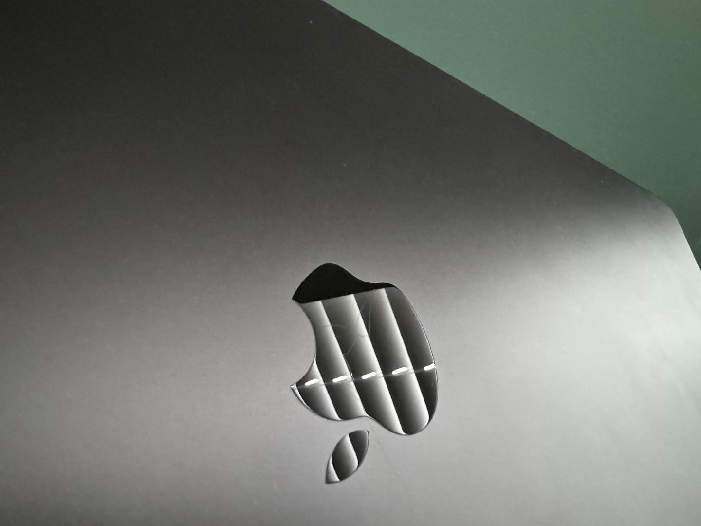 There's a surface scratch across the Apple logo on the top. It's only visible if you hold the machine in a way where the logo would reflect light.
