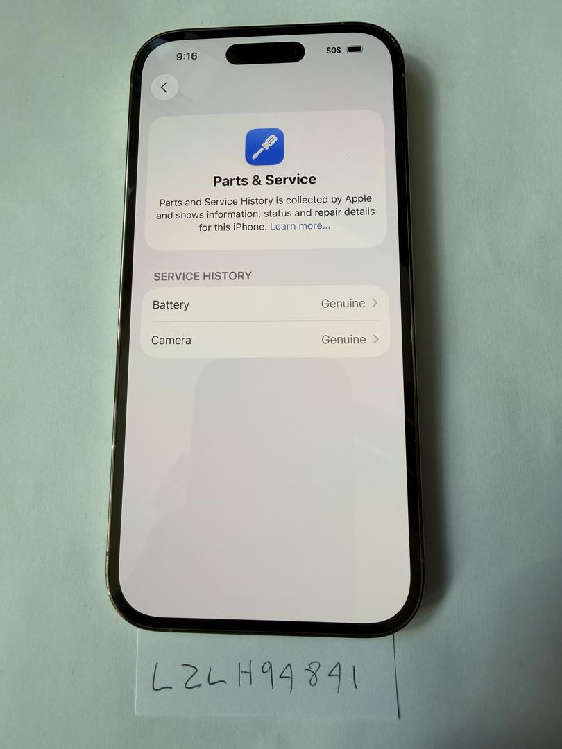 Service History shows Battery and Camera Genuine replacement. Phone also shows Refurbished by Asurion on the back.