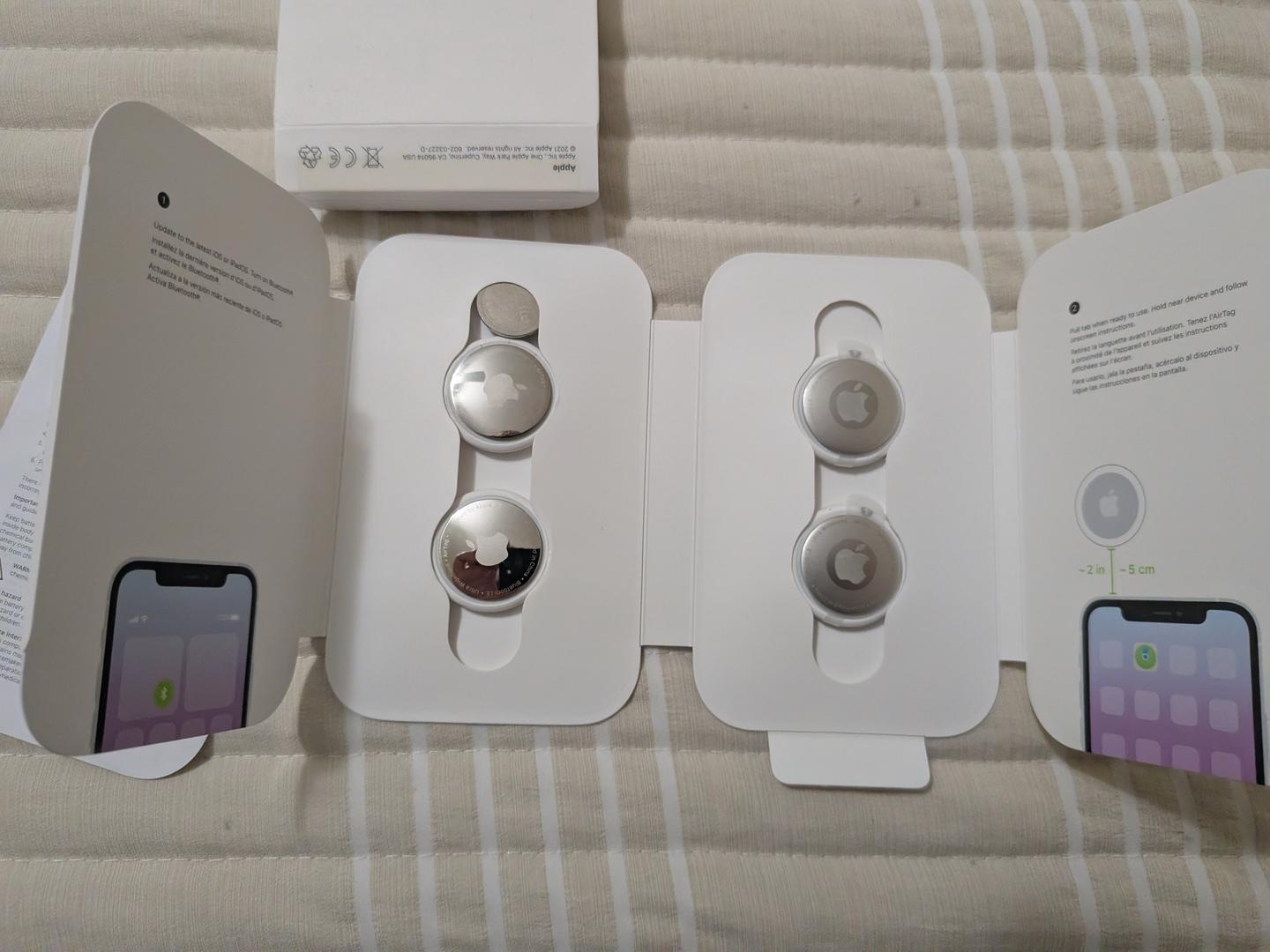 For the Airtags, I tried to connect them to my work phone, but was blocked by policy. I removed the battery strip from 2 of them but never connected them to anything. The two "opened" tags probably need new batteries, the other two should work out of the box. None of these were connected to any devices.