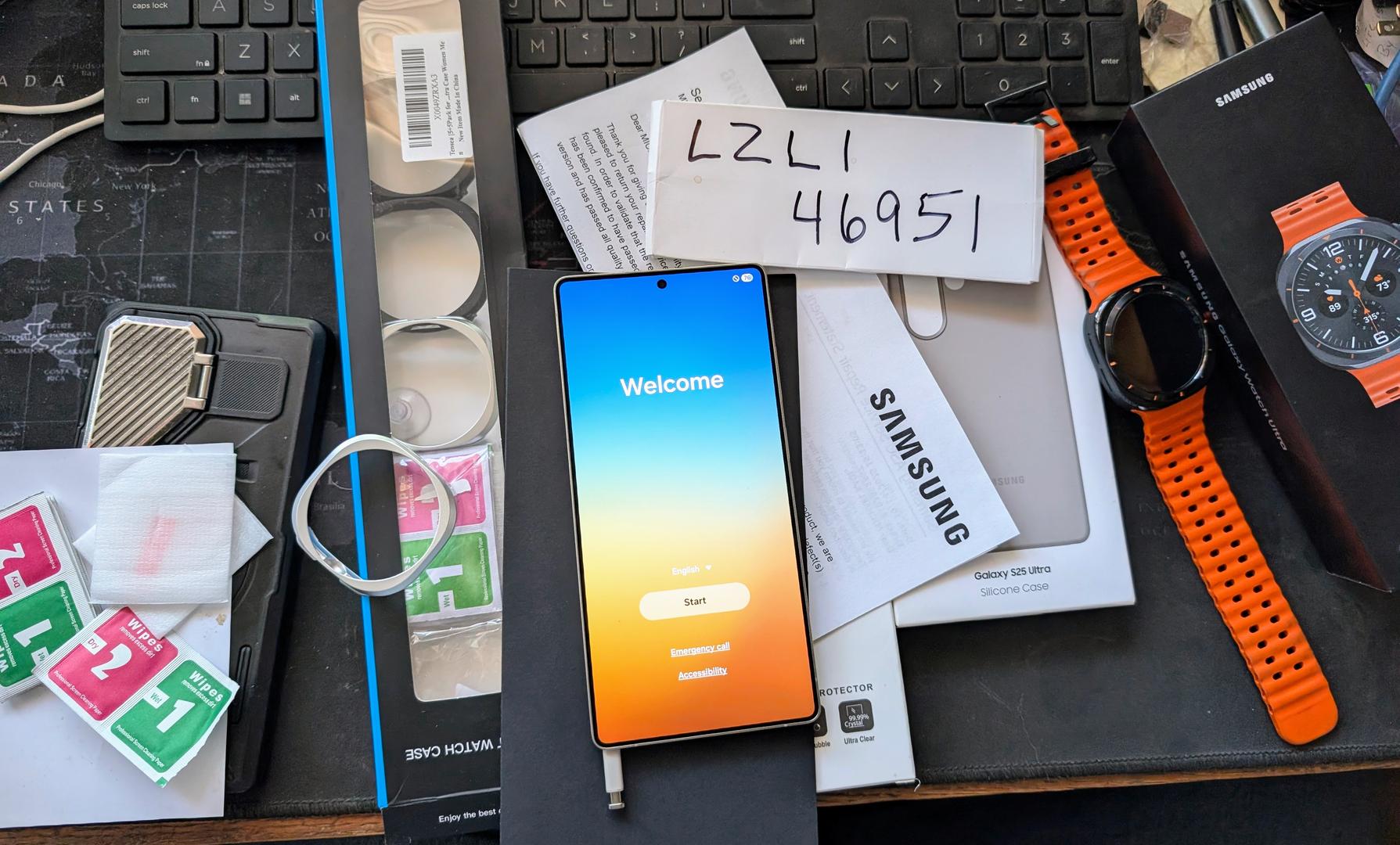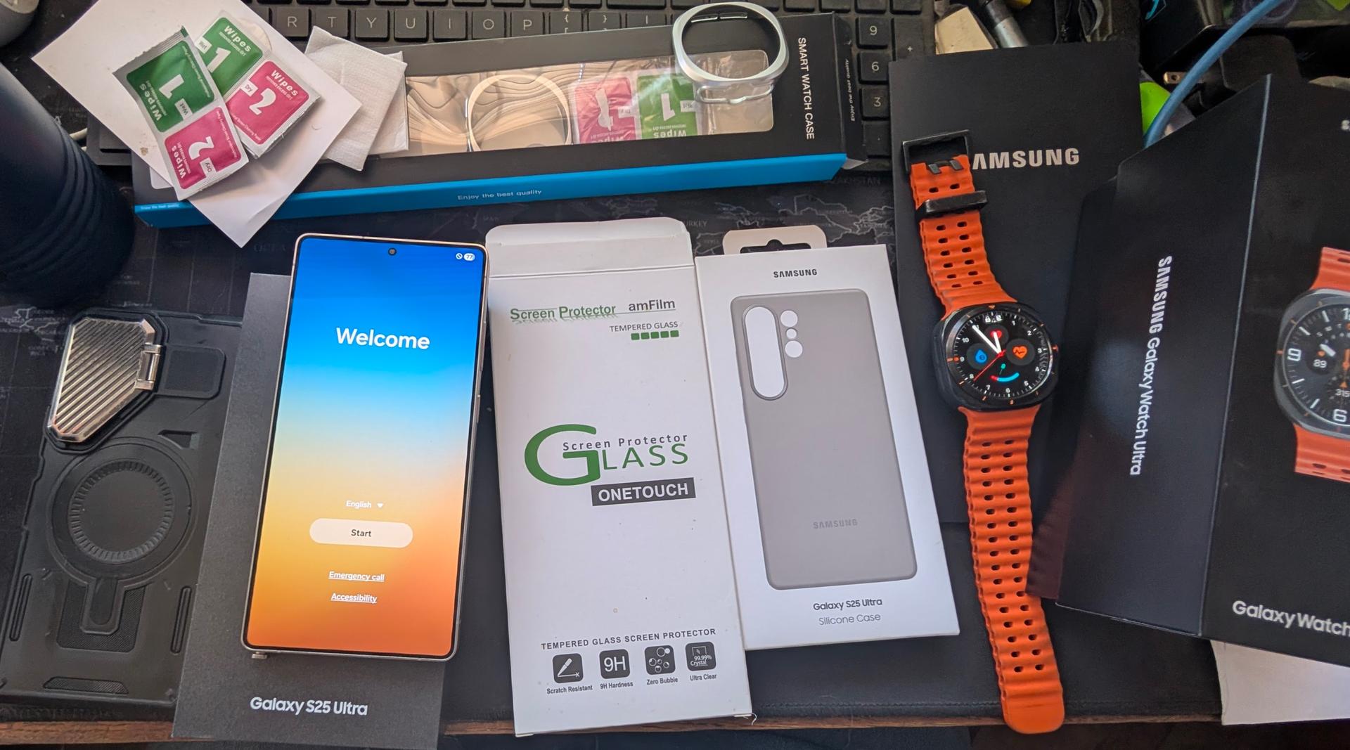 Two cases including one Samsung silicone case. New screen protector ready to install. Samsung Galaxy Watch Ultra Unlocked LTE with extras as well bumpers and screen protectors all included for this price. Just tested and returned from Samsung factory repairs with receipts for a defective camera replacement. Will include receipts and verification with package. Moving back to the Pixel ecosystem and giving up My Galaxy system