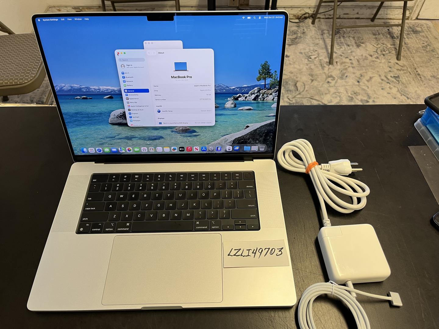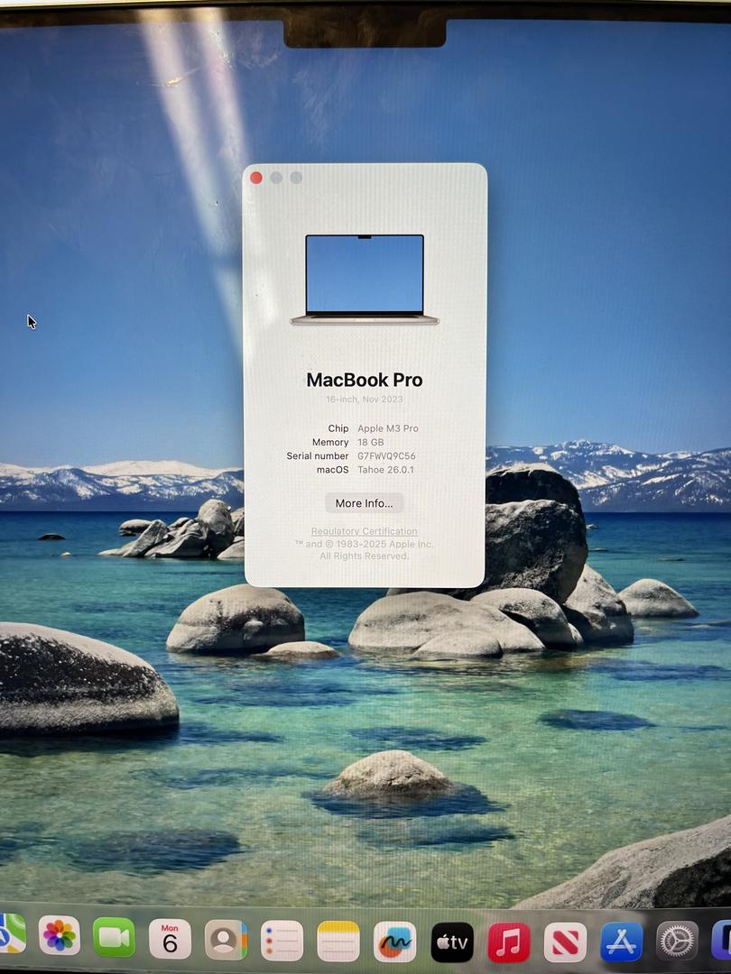 2023 Macbook pro 16" , M3 pro , 18 gb ram, 512 SSD, HDX screen. Nearly perfect, very light frame corner dent. Comes with charging system with cord extension.