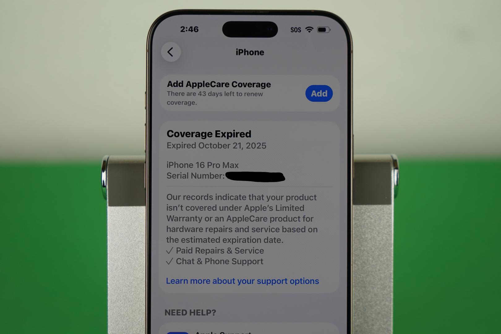 Standard warranty is expired, but AppleCare+ is still eligible for renewal — 43 days remaining as of 10/23/25