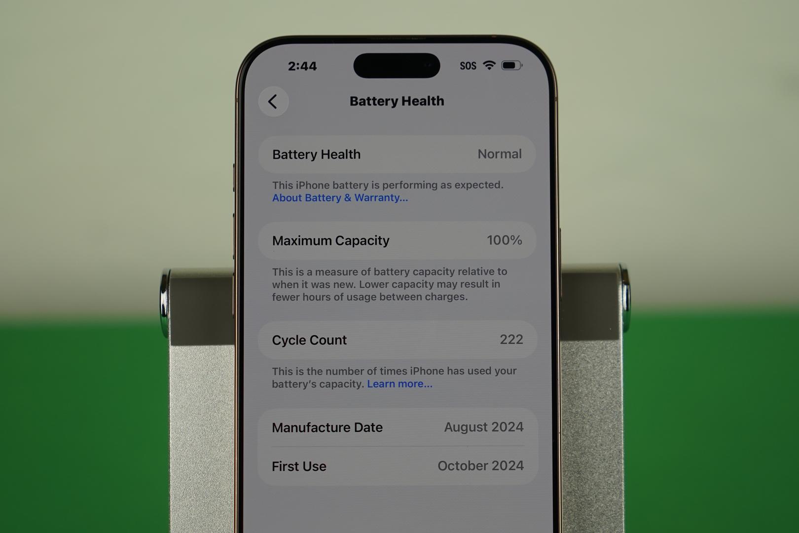 Battery health is 100% with 222 cycles — see photos for battery condition