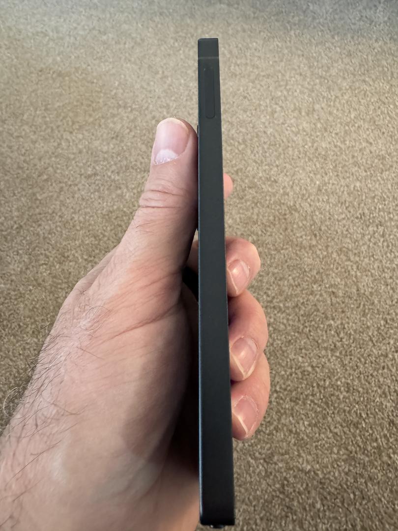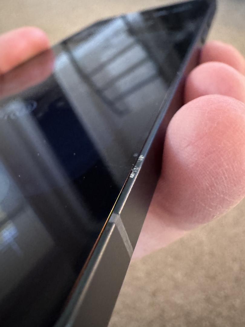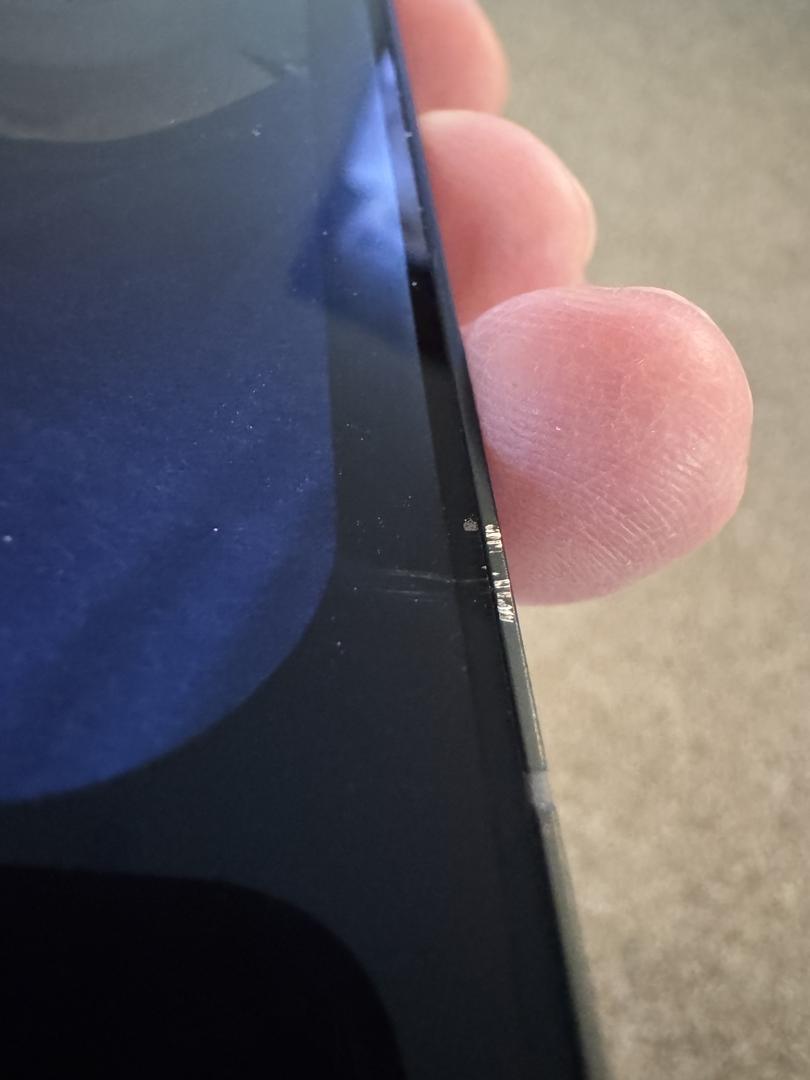 Small nick on the front edge of phone and screen. Most cases cover it.