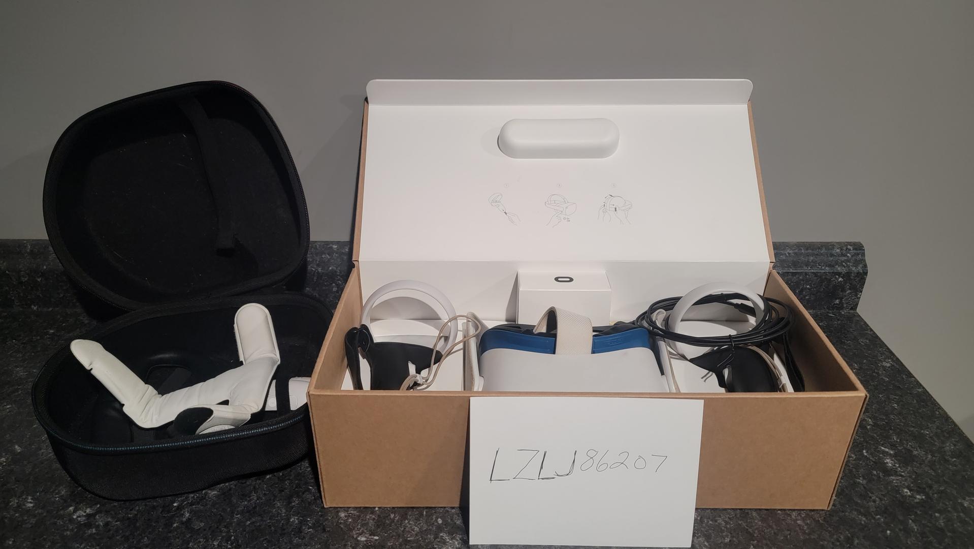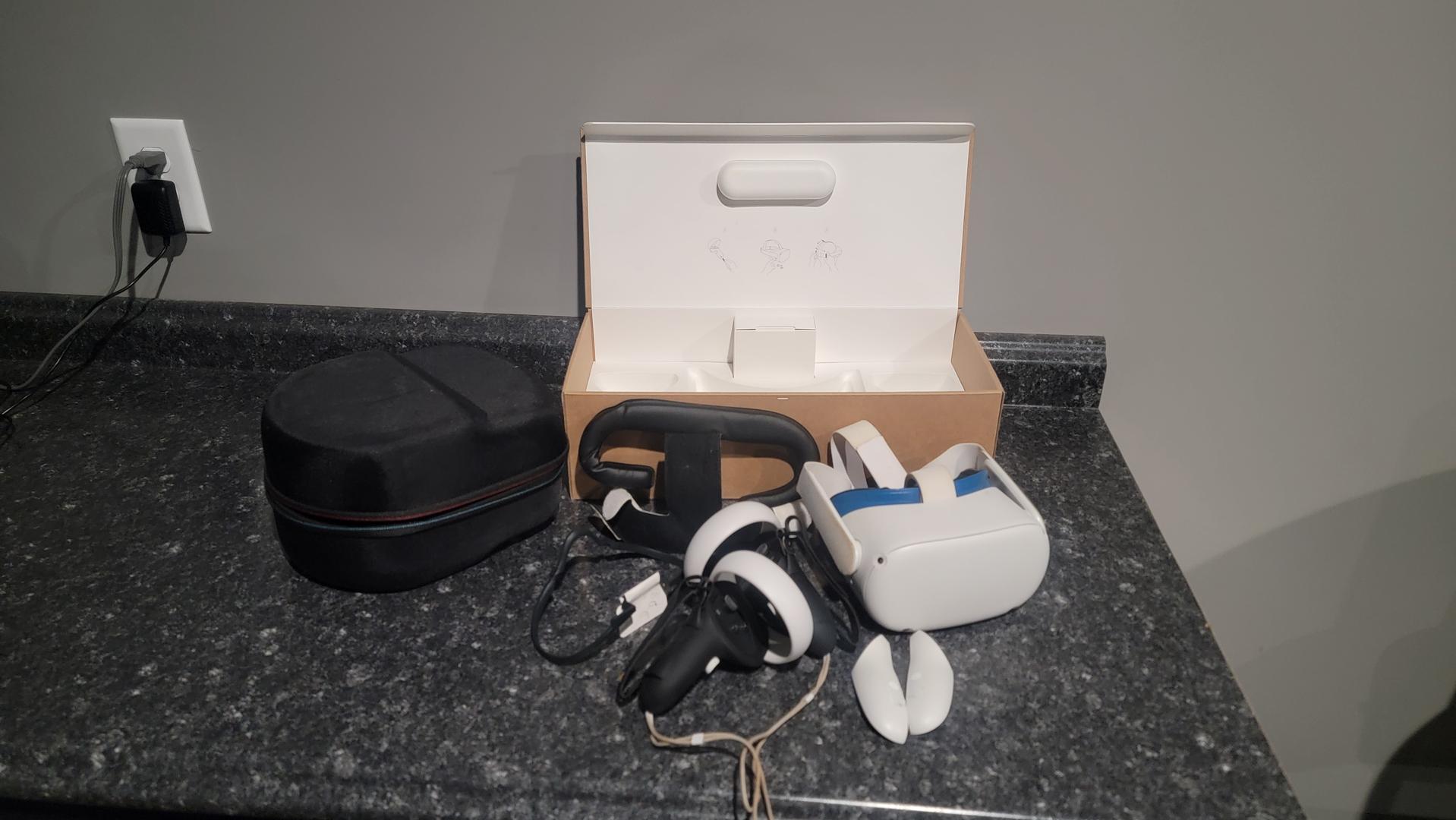 This quest 2 is the 256 GB version and has a VR Cover facial insert with 2 cushioned facial pads. I also have the Kiwi hand straps added on the controllers. Included with the headset you will get a padded head cushion for the strap itself along with a carrying case. This headset comes with the original box, however for the charger, it has the USB-C to USB-C cable, but missing the USB-C charging block. I've included a USB-A to USB-C cable with a USB-A charging block as a replacement.