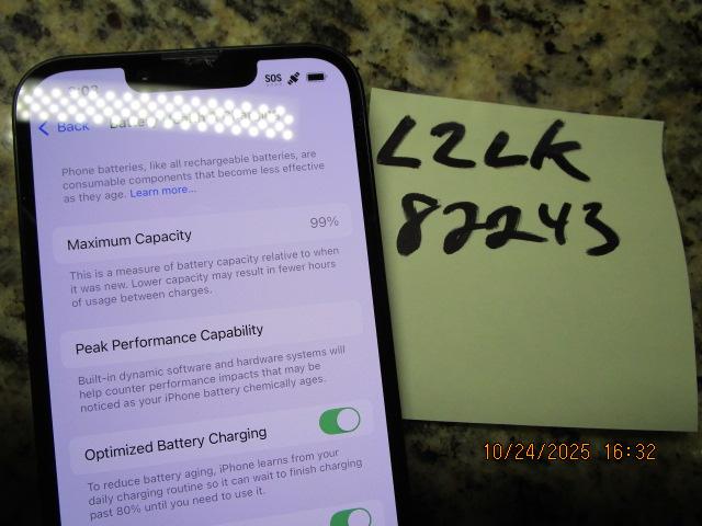 The phone in the pictures is the one you will receive. This is NOT a refurbished unit - its all original Apple parts. There is some heavy scratching on the display glass on the top right and bottom left sections - see pics. There is also some scratching on the back glass. The frame is in great condition. Battery health is 99%. This unit is the unlocked model so it will work with any wireless network. Currently running iOS 18.3.2. This is the phone only, no accessories and no charger.