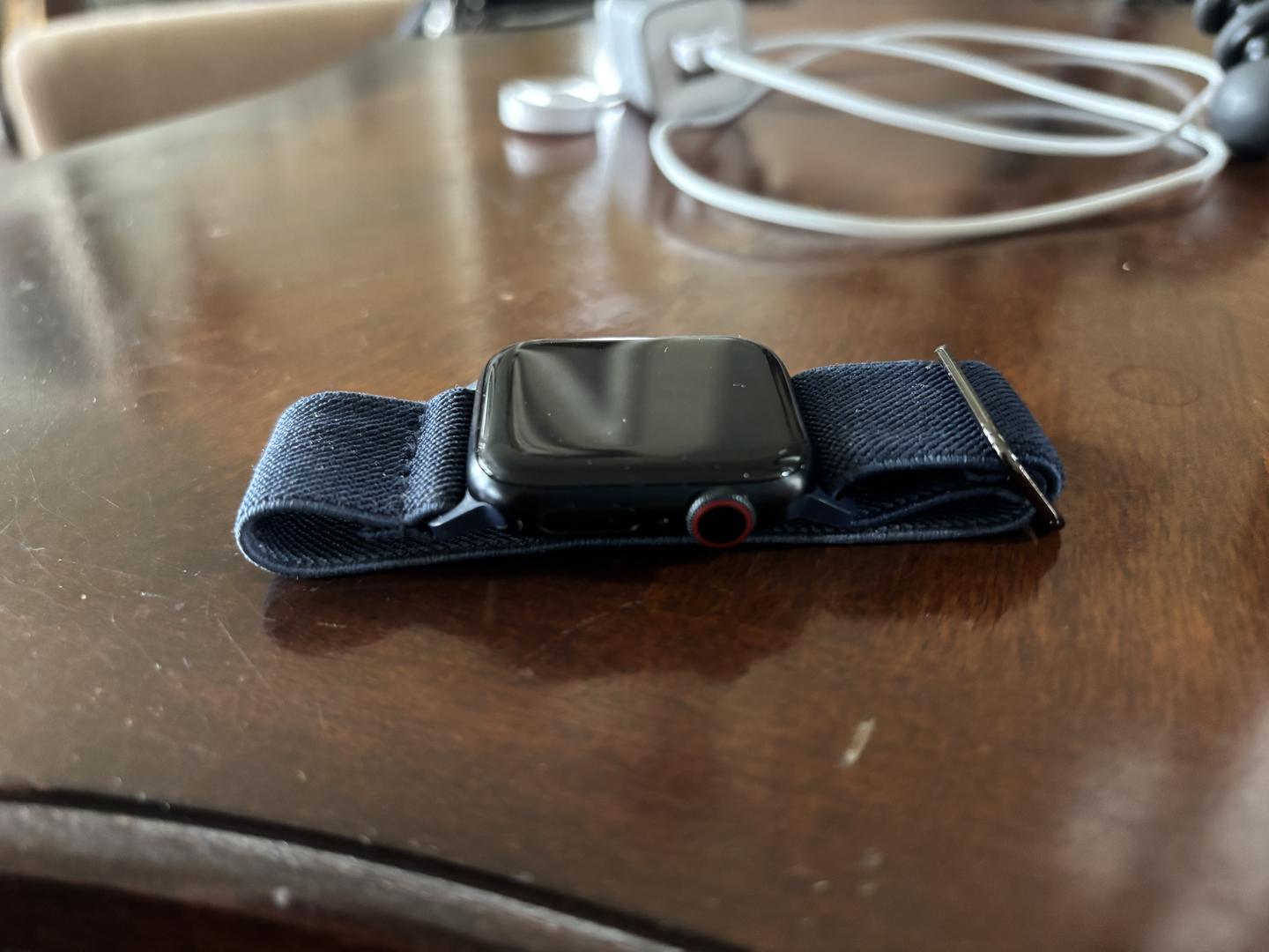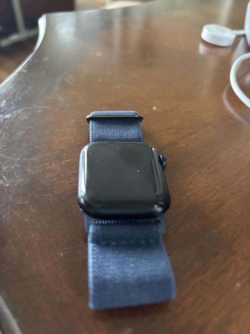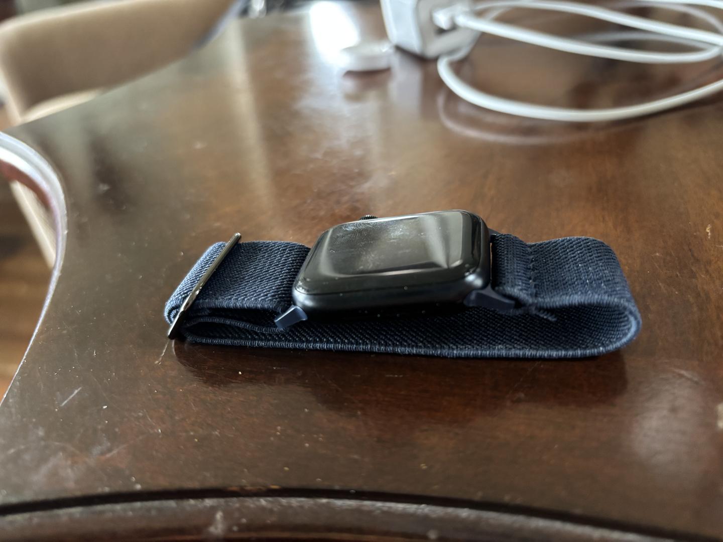 Selling my Apple Watch SE (2nd Generation), 40mm, black aluminum case with a navy blue elastic band.