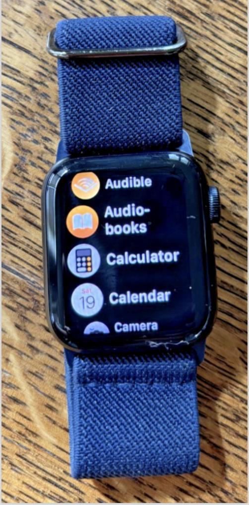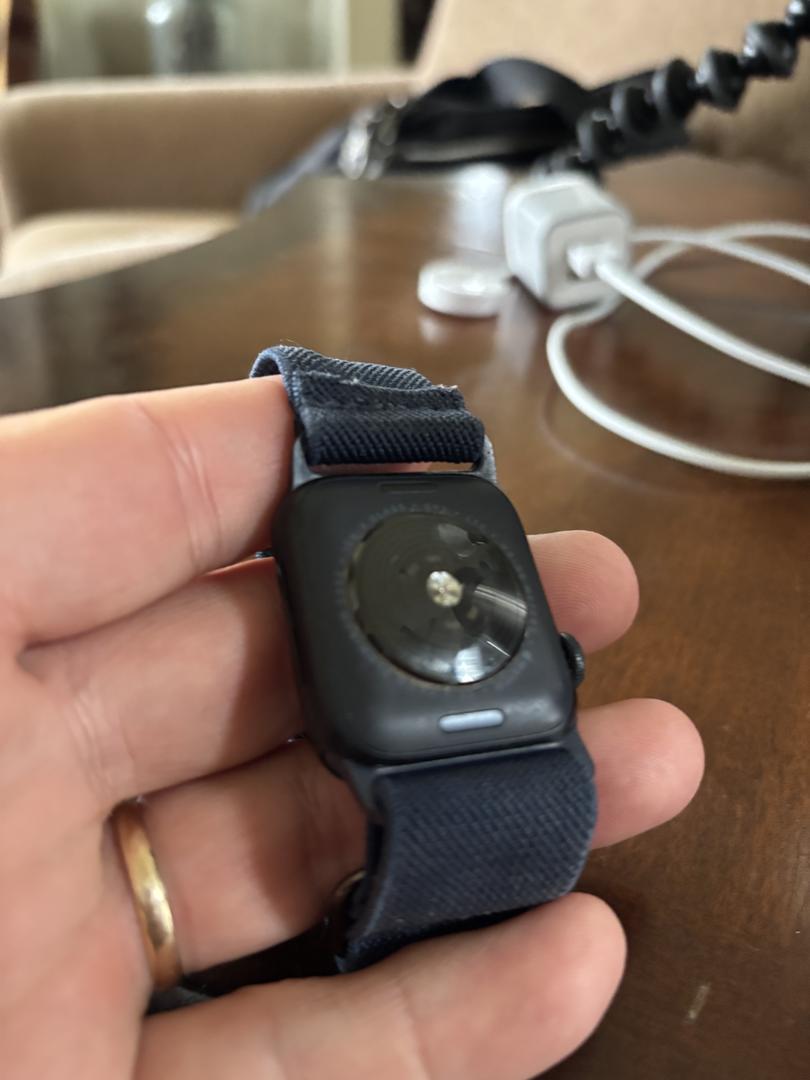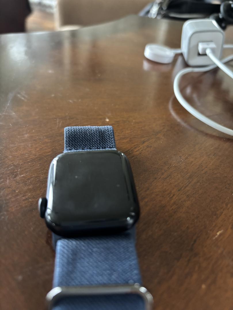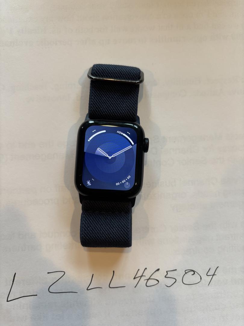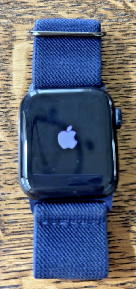 Selling my Apple Watch SE (2nd Generation), 40mm, black aluminum case with a navy blue elastic band.