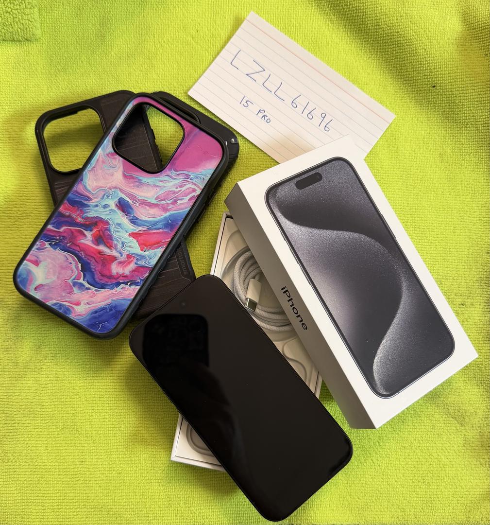 Selling my wife's mint condition iPhone 15 Pro 256gb in "Black Titanium"...been in a case with a screen protector since day one so it's in perfect condition. Comes with the original box and unused charging cable in addition to a few cases that are also in great condition. Thanks!