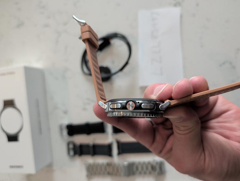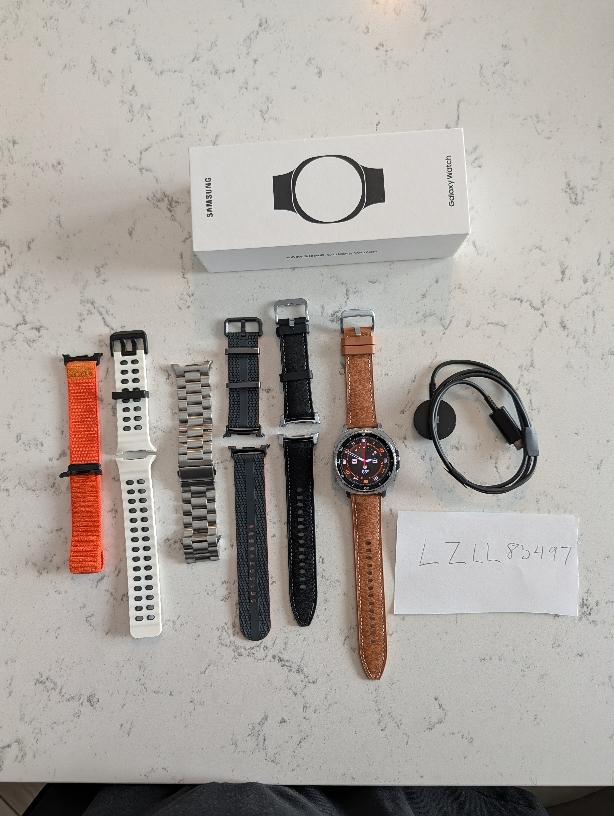 Perfect condition, barely used. This is the LTE model and it includes several extra bands, including official Samsung bands (black hybrid leather, tan hybrid leather, and black athlesure band), as well as three additional bands purchased from Amazon. Also includes the box and cable.