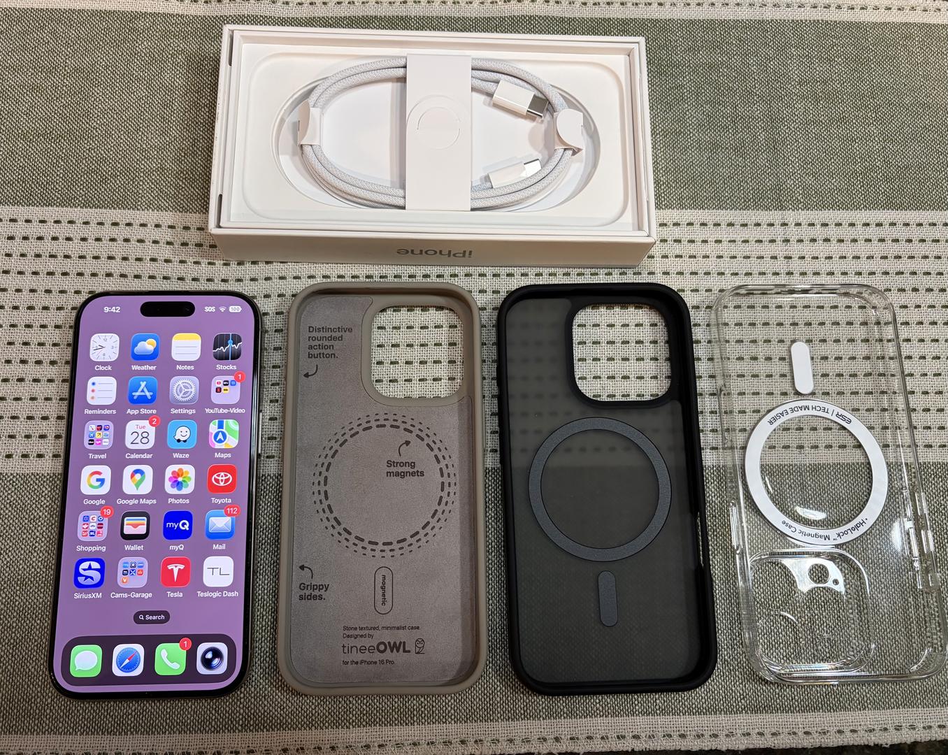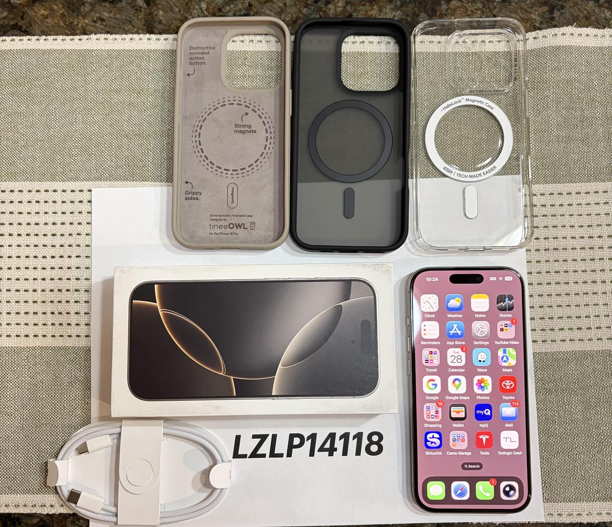 I have for sale my mint condition iPhone 16 Pro in Natural Titanium color with 256GB storage. No nicks, dings or scratches anywhere. Included are 3 cases as well as the box and unused Apple USB-C cable. I misplaced my actual box, but am including my wife's box, as we have the same phone. See my Swappa feedback for a worry-free transaction. Thanks!