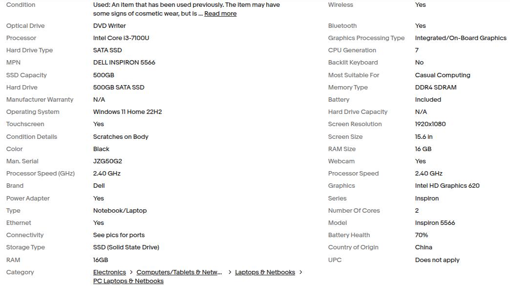 15.6" DELL INSPIRON 5566 INTEL CORE i3-7100U 2.40GHZ 500GB SSD 16GB RAM WIN 11 TOUCHSCREEN LAPTOP