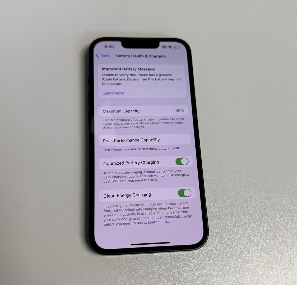iPhone 13 in Midnight with 128 GB storage. It’s factory unlocked for any carrier and has a new OEM screen and new OEM battery showing 91% battery health. The phone works perfectly but has some light scratches on the screen and on the bottom back of the frame — please review photos for exact condition.