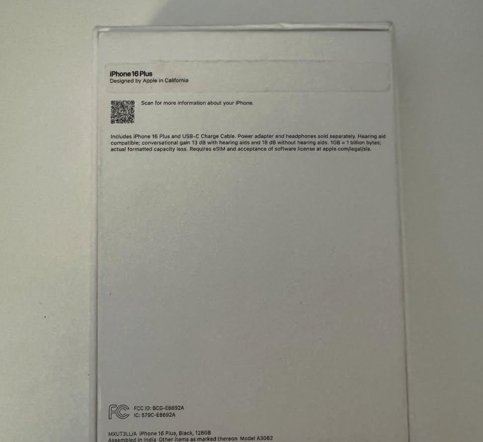 unlocked iPhone 16 plus black 128g, just open box, battery cycle count <5