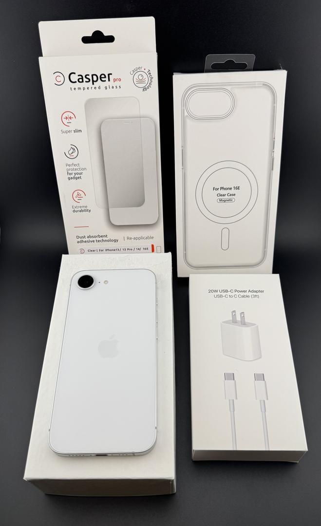 Included with your purchase is the good condition iPhone 16e, a clear protective case, a pre-applied tempered glass screen protector, and an aftermarket 20W charger.