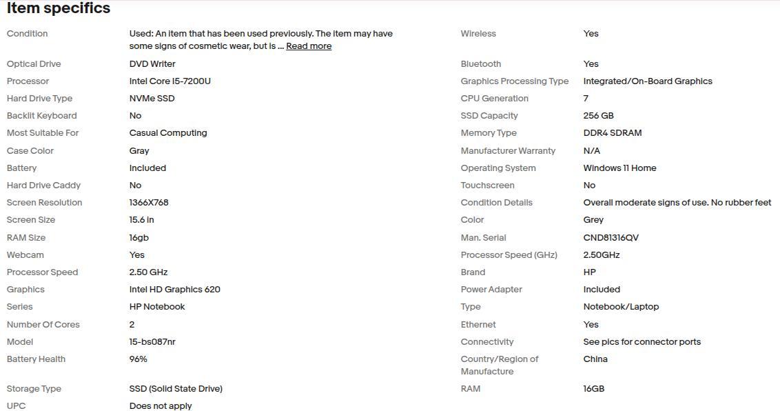 Used in overall good condition with moderate signs of use around body, lid and bottom cover. Missing rubber feet. Some wear on keys and trackpad as well as shown in pics, nothing extreme. Battery health at 96%. More product specs shown in specs chart pic also included in pics. Comes with genuine HP power adapter as well.